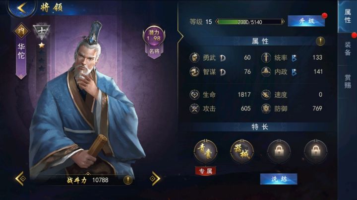 华佗,字元化,安微亳州人,曹操的老乡。华佗是中国历史上有名的神医,著有医书《青囊书》,擅长外科,发明了麻沸散这种手术麻醉辅助剂,还发明了健身习练的五禽戏。在三国中,曹操因患有头风症,召见华佗来治疗。而华佗不愿意前来,最后被曹操派人抓捕,死在了狱中。看来老乡之情也没有用啊。在《锦绣江山》中,华佗有较好的内政属性,可以给士兵增加生命。【传记】:名医,经常在外游学,四处行医。医术高超,擅长以麻沸