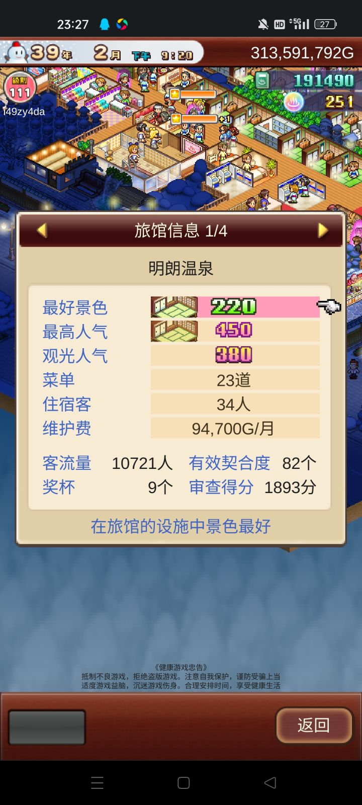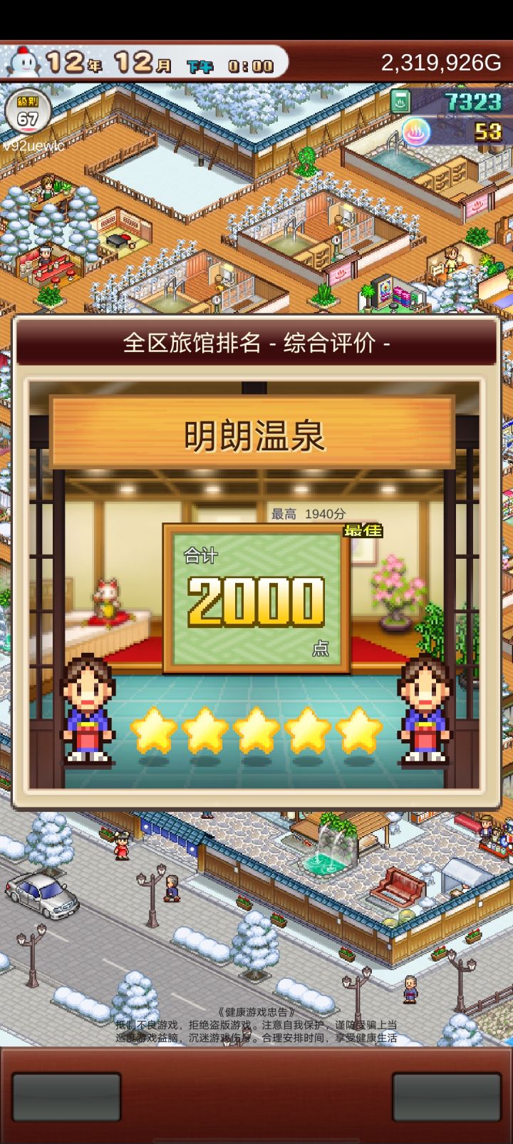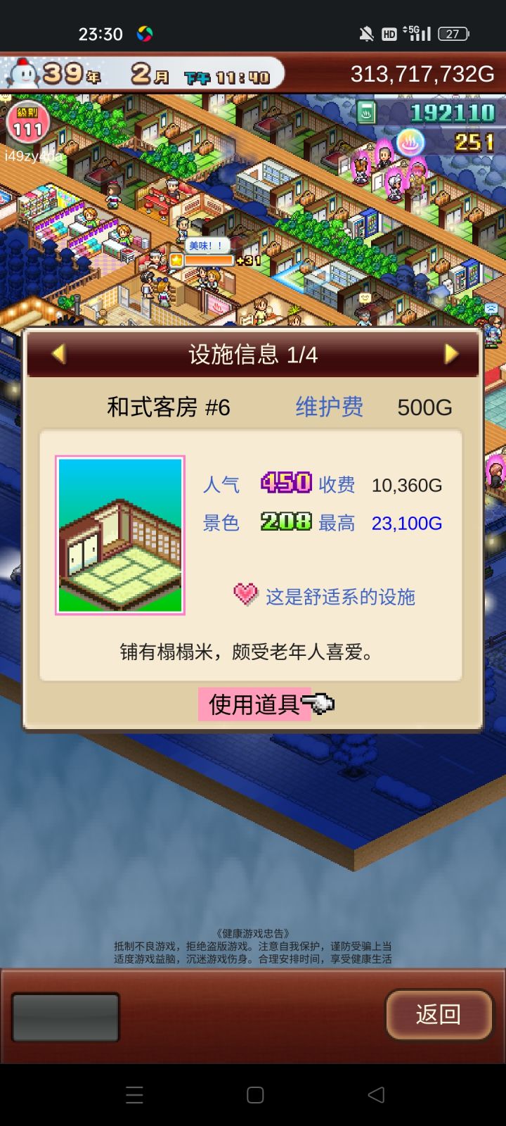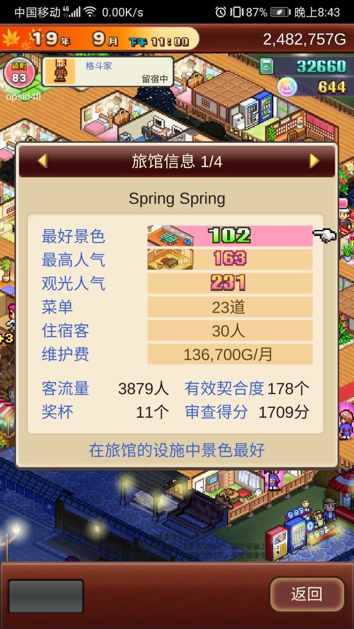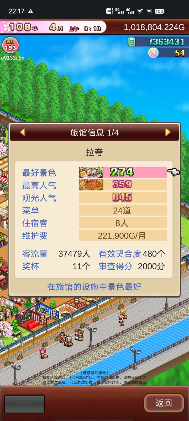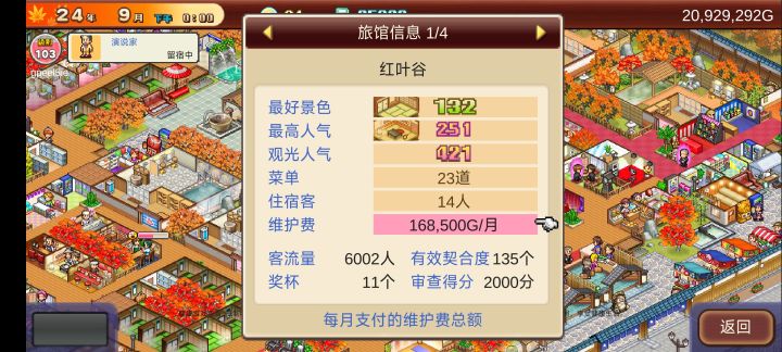 这个游戏主要是和式房拉满,本人审查评分因为差一个美食没开所以上不去,人气影响收入人气越高,房子的收入也就越高,如果人气到达一定程度的话,旅客来你这里住房子的话,钱会给双倍,景气影响挑战的成功率。