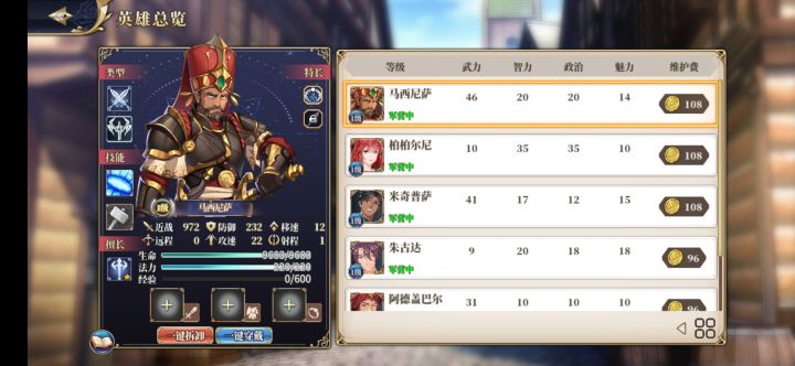 说实在的,这游戏的功能我都懂,但玩起来就真的不懂了金钱的获取无非就是税收+贸易,贸易国家越多,每回合的钱越多,投资基本如不熬出,升满了就解锁更高耐久的城防,实际税收也不见得加多少,哪怕庆典+加税唯一通关的就只有贸易加70%的国家,真的足够自产自用其他国家的话,我真心不够钱用一进游戏就打架,把别人的英雄都俘虏了,然后换钱花,但都不够用,养的人也不多,就2队军队12人,为的就是一队伍打架,一队