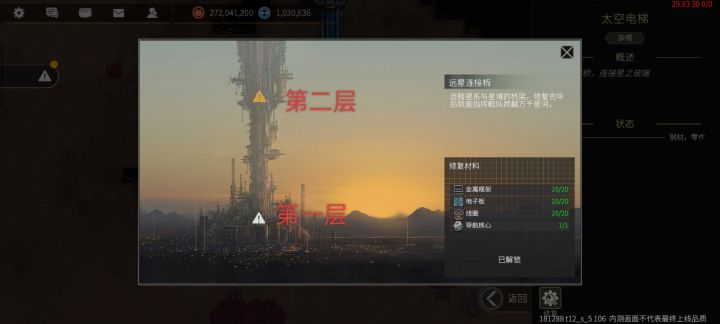 三、太空篇1.怎么才能上太空? 维修初始地图上的电梯(两层),位于地图中上方,凑齐材料点击维修,耐心等待小人搬运即可2.上太空能做什么? ①能前往厄斯星系的湍流贸易港购买或出售材料和道具 ②能采集太空中的稀有矿物,此类太空矿是制作部分舰装必不可少的材料 ③能前往其他星球,可根据自身所需材料前往其他星球进行采集或定居 ④能前往空间站制造舰装和舰船3.如何将小人或物资带上飞船? 点击