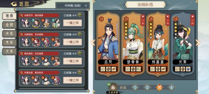 导引:本章攻略包含:主线任务魍魉树海(已完成),修复魂魄(未完成),神龛(已完成)无支线任务无神器获取青州篇 魍魉树海写在前面:魍魉树海通关之后,苍雪会加入到木系的毒海池中,而苍雪使用场景较少,会污染卡池,我们主要需要楚青青和鸠真真的星级,所以想培养这两位9星的玩家可以在苍雪没进卡池之前尽量多的抽取。从本图开始木队我将使用两种队伍配置,分别为:木1队:吕风(玄天幻妙诀,法力装),楚青