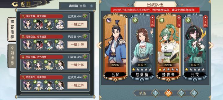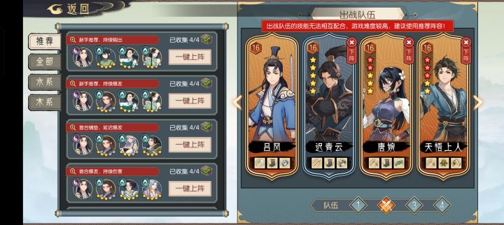录制了两个常用的队伍,过主线装备我只推荐天悟和青青两个带法力装,其他的都带肉。打法如图。自己练练就行,冰刃不用是会存下来的。毒就不用多说了,所以核心就是活着,多活一回合输出会多很多。多做血量丹,每回合吃一个。基本先手必定能打赢。差5级就看本事了。#长生天机降世