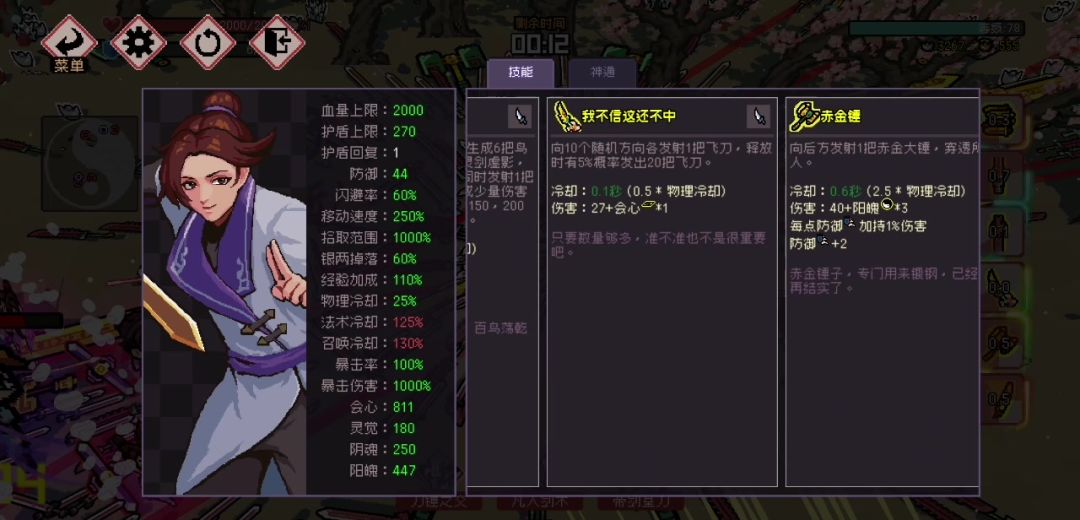 快速把七天奖励给领完,然后直接购买胡媚娘,然后拿桃子换天赋点,觉醒银元天赋。进入之后买一个技能,断网,你就可以无限刷技能了直接直接一个金色的针,其他全是钉子,然后站在原地不停献祭就可以分屏刷视频了。最后就可以拿胡媚娘刷所有角色,和桃子。我封面那个是属性刷满了,无聊试一下其他的技能,这边还是推荐钉子,是真的好用!!!!