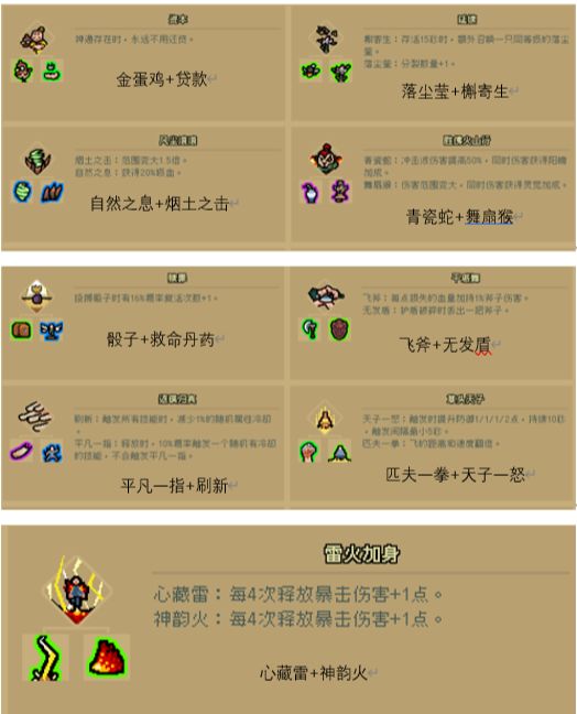 龙太子+凤凰女(登场时回复30%血和护盾) 小浪沉+ 飞凌锭(飞凌锭在指定位置生成一次小浪沉, 小浪沉造成的10%转化为护盾) 闪电链+黑球(闪电链每次命中产生一个同等级的黑球最小间隔0.5秒 ,黑球每两次释放提高一点移动速度) 挥砍+飞轮(挥砍范围提高,飞轮物理冷却减少) 贪吃羊+菜刀牛蛙(贪吃羊死亡时向8方发射羊豆,菜刀牛蛙死亡时向6方发射菜刀) 这些我没有只能打字了