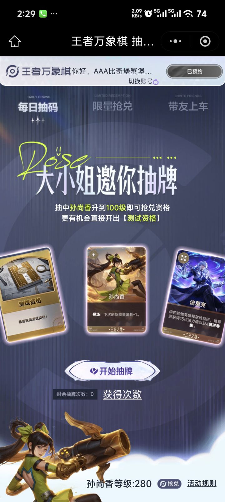 我我不知道为啥我这么黑,抽了30发了还没中,等级都到280了,每天早上10:00点都没有。