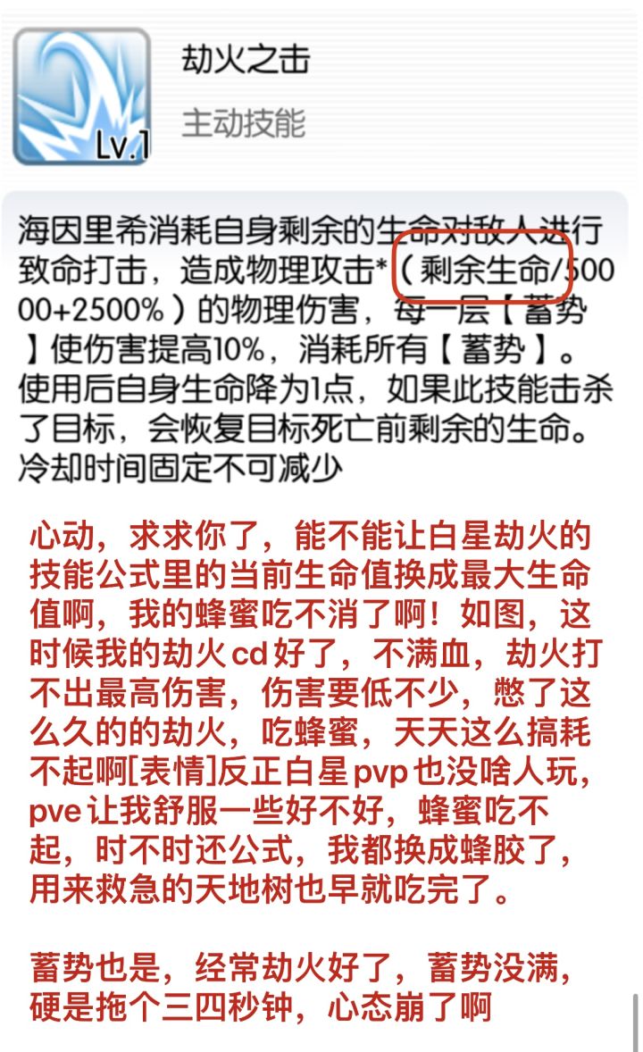 心动,求求你了,能不能让白星劫火的技能公式里的当前生命值换成最大生命值啊,我的蜂蜜吃不消了啊!如图,这时候我的劫火cd好了,不满血,劫火打不出最高伤害,伤害要低不少,憋了这么久的的劫火,吃蜂蜜,天天这么搞耗不起啊捂脸哭反正白星pvp也没啥人玩,pve让我舒服一些好不好,蜂蜜吃不起,时不时还公式,我都换成蜂胶了,用来救急的天地树也早就吃完了。