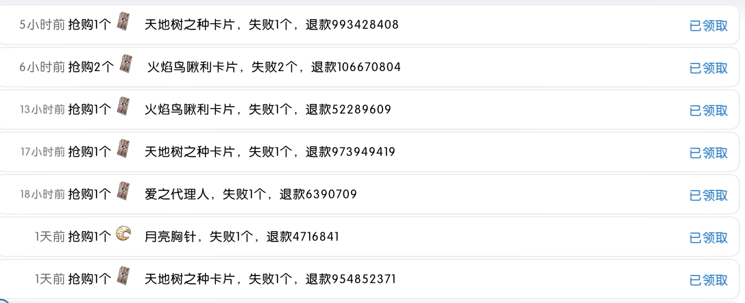 抢购天地树卡一个多月了,每次就40个人左右抢,为什么一直没抢到,是不是我的号有什么问题啊?区:守护永恒的爱昵称:阿刖数字ID:4296877391