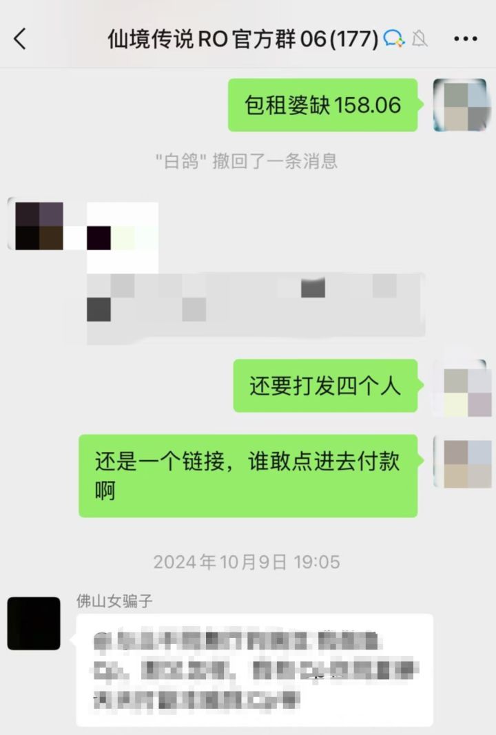 最近有人跟我说Ro一区到初心服的知名(骗钱)人士佛山Co(以下简称佛Co,非商人Co)说有个叫韦姓男人欠我158的事情。我无辜被牵连想要说明一下,我与佛Co的恩怨最多是她来骗钱被我揭穿了(具体发生在24年官方06群)当时我甩了二张她发给群里两个成员的微信截图,后来她退群了……突然上周五在公会群被人艾特,有点莫名,想来说明一下,首先我从来没和她有关金钱瓜葛,所以她说的什么158块不是她欠我的,