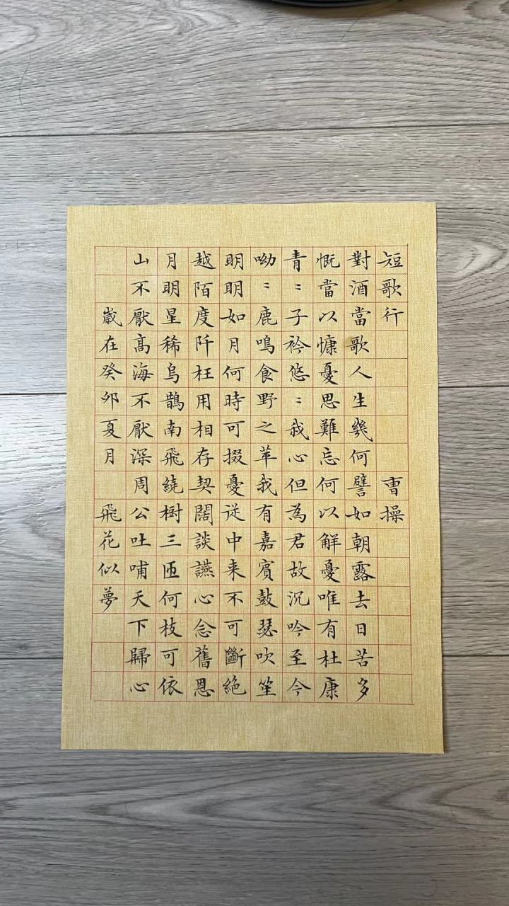 对酒当歌,人生几何。譬如朝露,去日苦多。慨当以慷,忧思难忘。何以解忧?唯有杜康。青青子衿,悠悠我心。但为君故,沉吟至今。呦呦鹿鸣,食野之苹。我有嘉宾,鼓瑟吹笙。明明如月,何时可掇?忧从中来,不可断绝。越陌度阡,枉用相存。契阔谈䜩,心念旧恩。月明星稀,乌鹊南飞。绕树三匝,何枝可依?山不厌高,海不厌深。周公吐哺,天下归心。