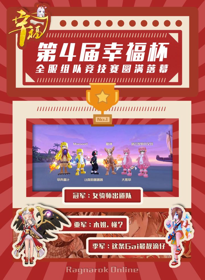 第四届幸福杯圆满结束~✿✿ヽ(°▽°)ノ✿恭喜女骑师出道队伍获得本届幸福杯冠军。就在笔者写帖子的时候,竟然有爆炸新闻出现,竞技场休闲模式通服了!!!难道,下届幸福杯可以和二区的大佬一起玩耍了吗?上周日结束比赛后,我们发放了一份问卷,共收到了57位家人的反馈,我们会根据可行性认真考虑每个家人的要求。目前幸福杯的困难有:工作人员人手不够、直播系统不上线,全靠玩家提供……希望下届有志愿者来帮忙