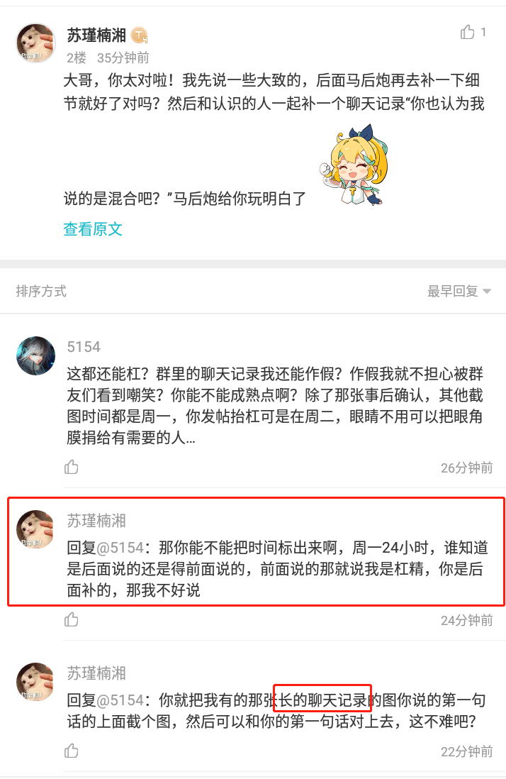 原本以为发完血案③杠本就会消停,毕竟有截图证据证明其所发视频及言论均源于自身主观臆断。没想到她还能杠出新角度、新花样,说我群内言论是发在她颅内高潮之后,属于事后补充说明是马后炮,所以便有这篇血案④杠本马后炮杠点截图如下虽然不用再刻意证明你是杠精本精,但只要你还在抬杠,我会继续发帖辩证,直到你无杠可抬,社死为止。当日群内部分聊天截图如下:从群里开始说信仰生效问题到杠本小弟转发过来的杠本群内高
