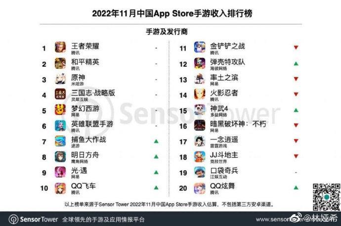 【2022年11月中国手游发行商全球收入排行榜:腾讯、米哈游、网易位列前三】Sensor Tower商店情报平台显示,2022年11月共43个中国厂商入围全球手游发行商收入榜TOP100。由于腾讯和朝夕光年等厂商在海外市场推出的新游表现强劲,这43家厂商合计吸金20.7亿美元,相较10月增长11.3%,占本期全球TOP100手游发行商收入40.2%。还抓着恶心的精炼去搞干嘛,你看排行榜上龙头几个