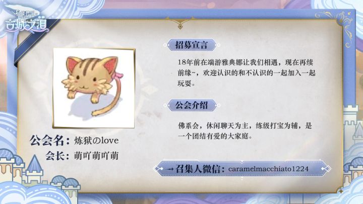 新玩家,老公会新开,新起点,新征程,我们是炼狱のlove,我们是佛系养老会,聊天压马路第一,练级打宝第二。雅典娜让我们相遇,守爱让爱延续,让我们把传承的故事继续讲下去~