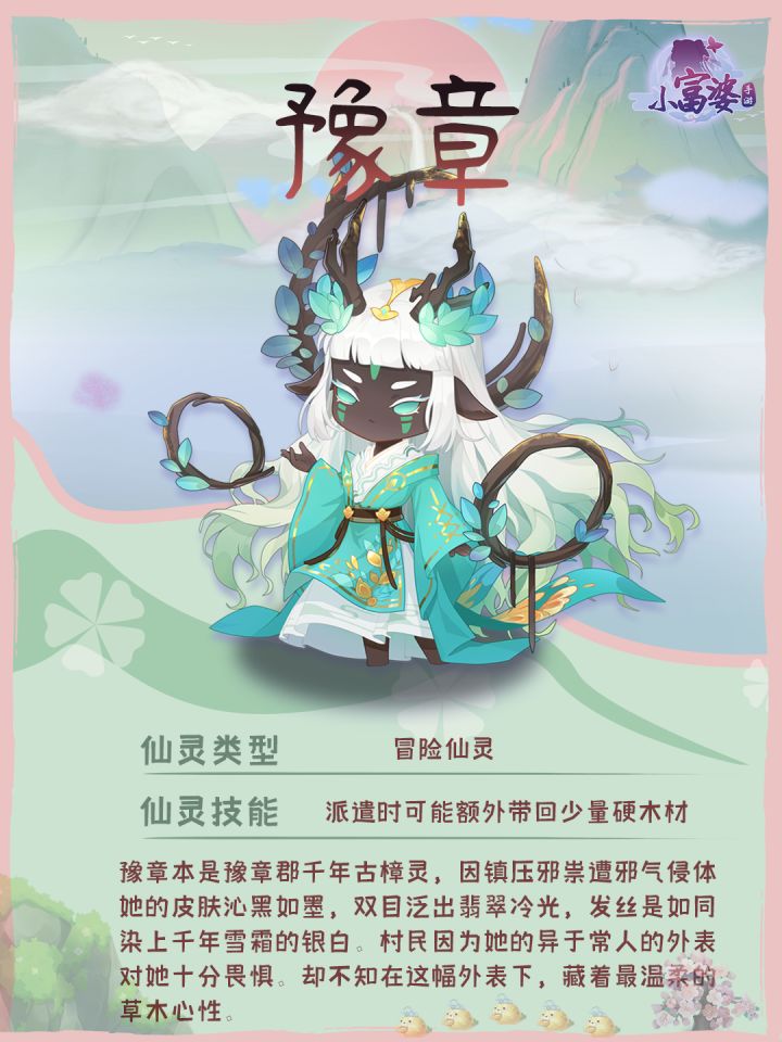 豫章本是豫章郡千年古樟灵,因镇压邪祟遭邪气侵体,她的皮肤沁黑如墨,双目泛出翡翠冷光,发丝是如同染上千年雪霜的银白。村民因为她的异于常人的外表对她十分畏惧。却不知在这幅外表下,藏着最温柔的草木心性。✦仙灵类型:冒险仙灵✦仙灵技能:派遣时可能额外带回少量硬木材--------------------------------------------------------------目前我们的