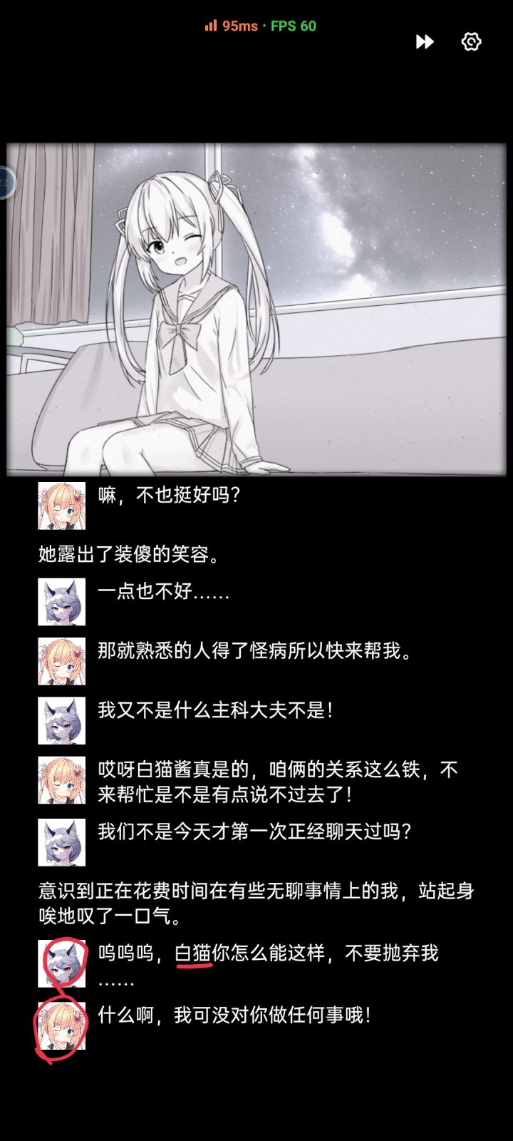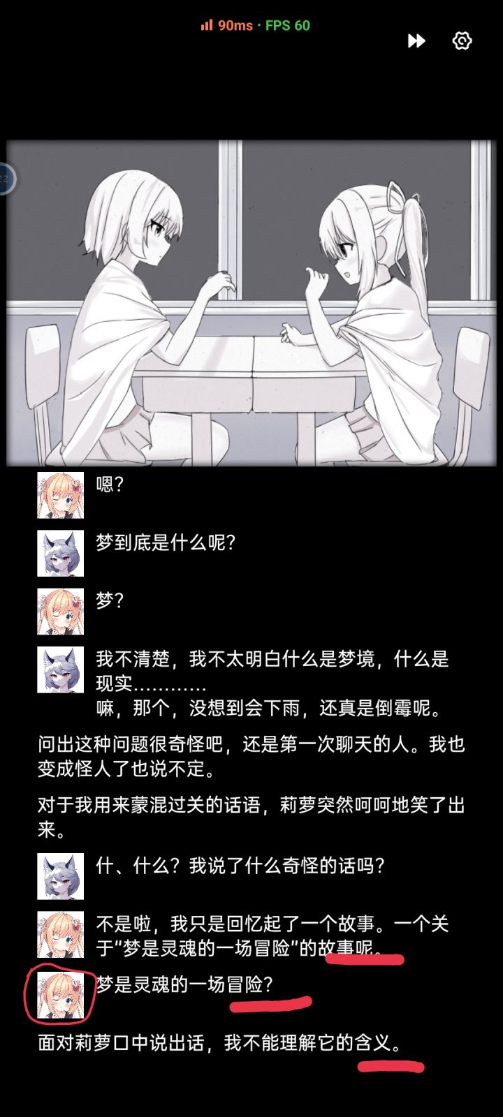 可以很新颖但看剧情时发现几处图片错误从语境来看,下面前两张图中两个人说的话是不是反了从语气来看第三张图是不是应该是莉萝说的话,但这句话前没有图片,变旁白了我感觉需要将它们改正
