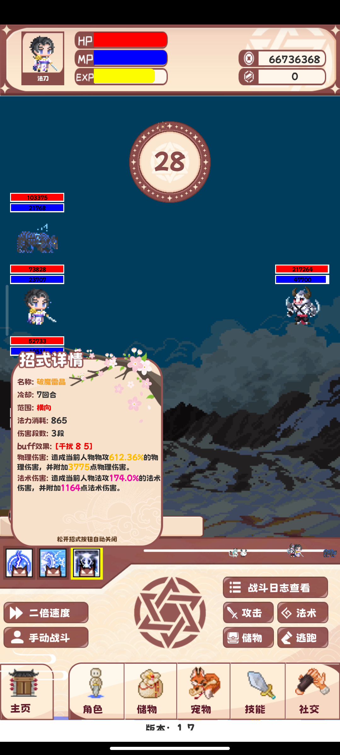 猫妖王巅峰,终于过牛了 牛伤害太高了,还好闪避多次,把蓝磨完了 也可能是猫防御太低了 主角六品武王,37万战力,就主要放减速致盲跟控制技能 只是,除了减速致盲外的控制看起来也没什么效果就是了