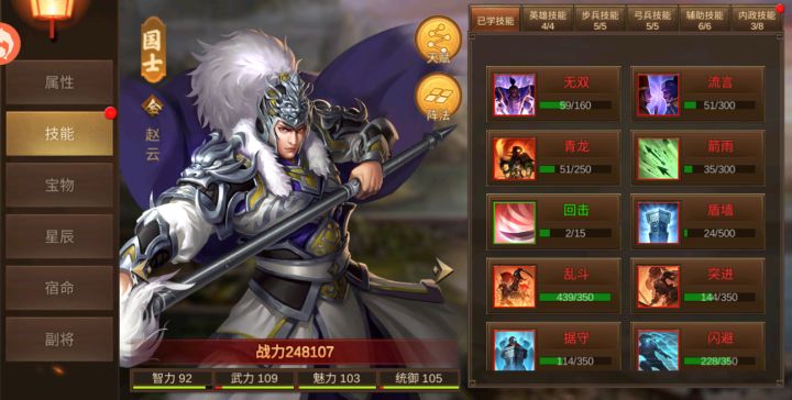 技能碎片是游戏中提升战斗力的重要资源,但它种类繁多,如何分配这些碎片对新手来说就成了一个问题。为了各位主公能在战场上一往无前,在此就稍微介绍一下技能碎片的分配方法吧~游戏中的武将分为全才、武将、文官三种职业,可以携带的兵种又分为步兵、骑兵、弓兵、方士这四种。每个职业和每个兵种都有对应种类的技能,它们都会消耗同样的技能碎片。所以,在给武将分配技能时就要合理分配,才能使用有限的资源,最大限度的提高战
