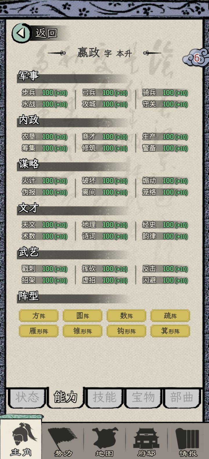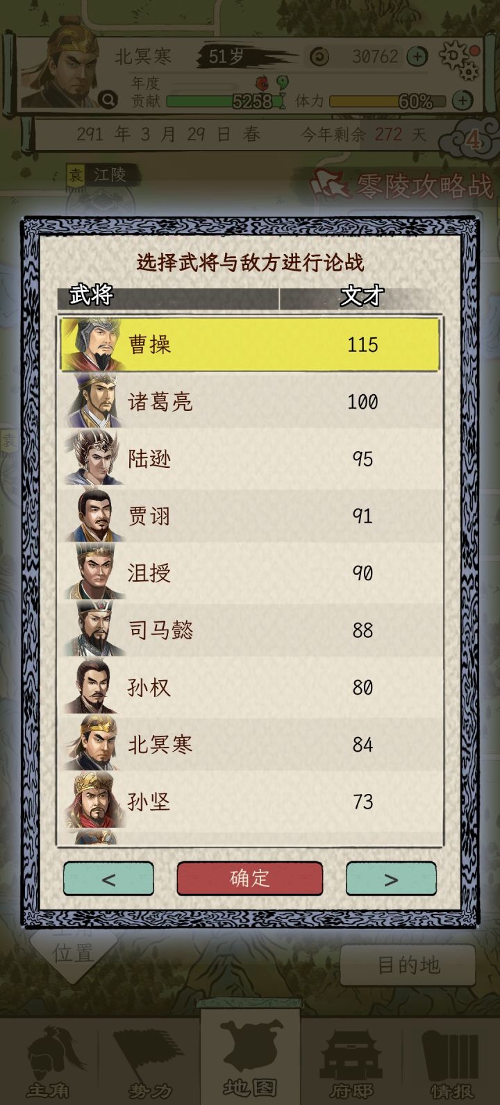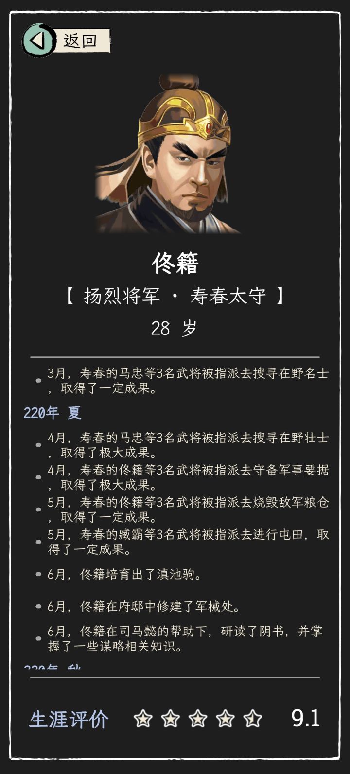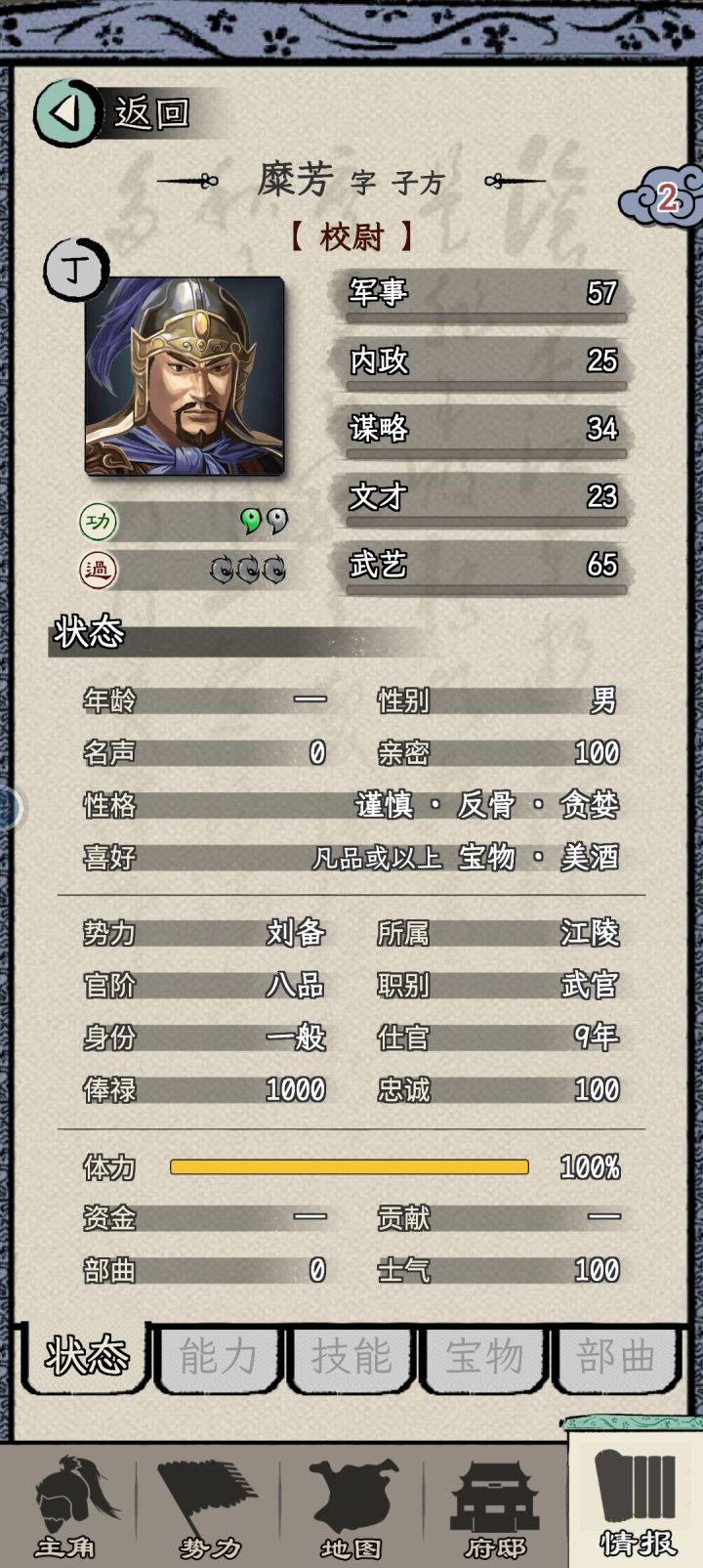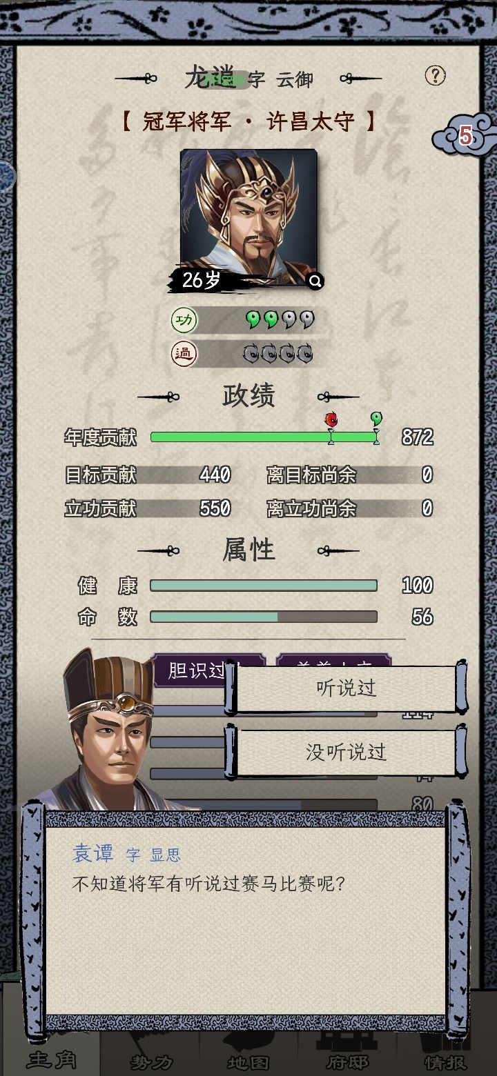 结合其他大佬的方法,一点点自己的小心得,选势力首选何进,次选吕布,第一次打仗前千万不要磕太多药,够做任务的就行,其他大佬教的是第二次打仗前五品,第二次打仗赢了就能当太守,但鄙人不才,二战结束才五品,如果是这样,二战一定要输,不能嬴,所以二战前没升五品的也不建议磕太多药,二战输了以后,可以疯狂磕药,三战赢了直接太守,50岁才如此面板,太难了,老婆的技能是博闻强识,可以反复刷属性,就是太费时间了。