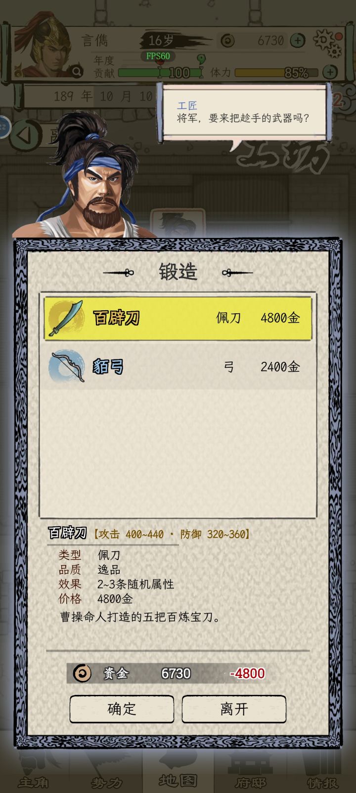 这个游戏目前的精髓是当太守后的攻城略地,越早当太守越舒服,越早统一天下。玩了两天,由于游戏内容不多基本弄懂了,分享一下萌新的通关攻略。1、基础属性介绍(1)体力:内政,巡城,赶路,比武,读书等会消耗体力。体力低于30点会生病,个人属性大幅下降,健康会临时降低,健康低于年龄就有概率死亡。(2)健康:随着年龄增长一般会有所变动,可以去酒馆打听“见闻”,找到华佗针灸提高健康,一年限制一次,每次需要