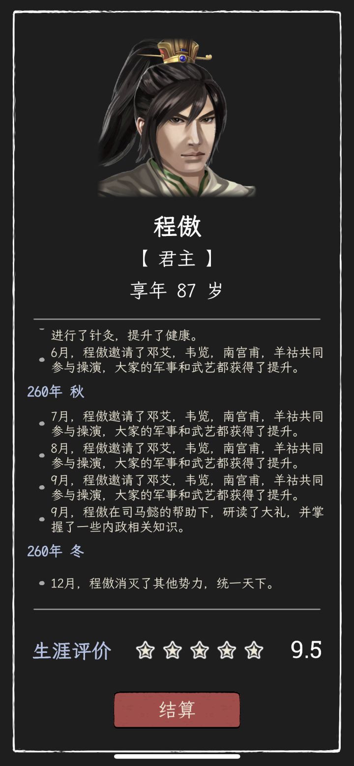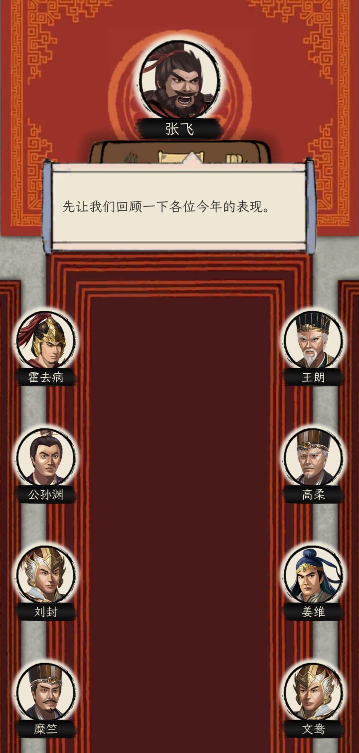 终于一统了,曹老板一家死完了居然让张飞当主公,很有想法嘛我没什么绝将,最多的时候就三个,诸葛司马(这两个莫名其妙突然就在了)还有一个招募来的不认识,分城里倒是很多,但是拉不过来或者我也不知道怎么弄过来但也不重要…刘备是第一批被灭的,灭了后全到小沛了,后面一直在那熬到老死(也想过提升亲密度拉过来,但太浪费时间了就算了)首先先讲下50岁后做的都是重复的,有点无聊,希望能
