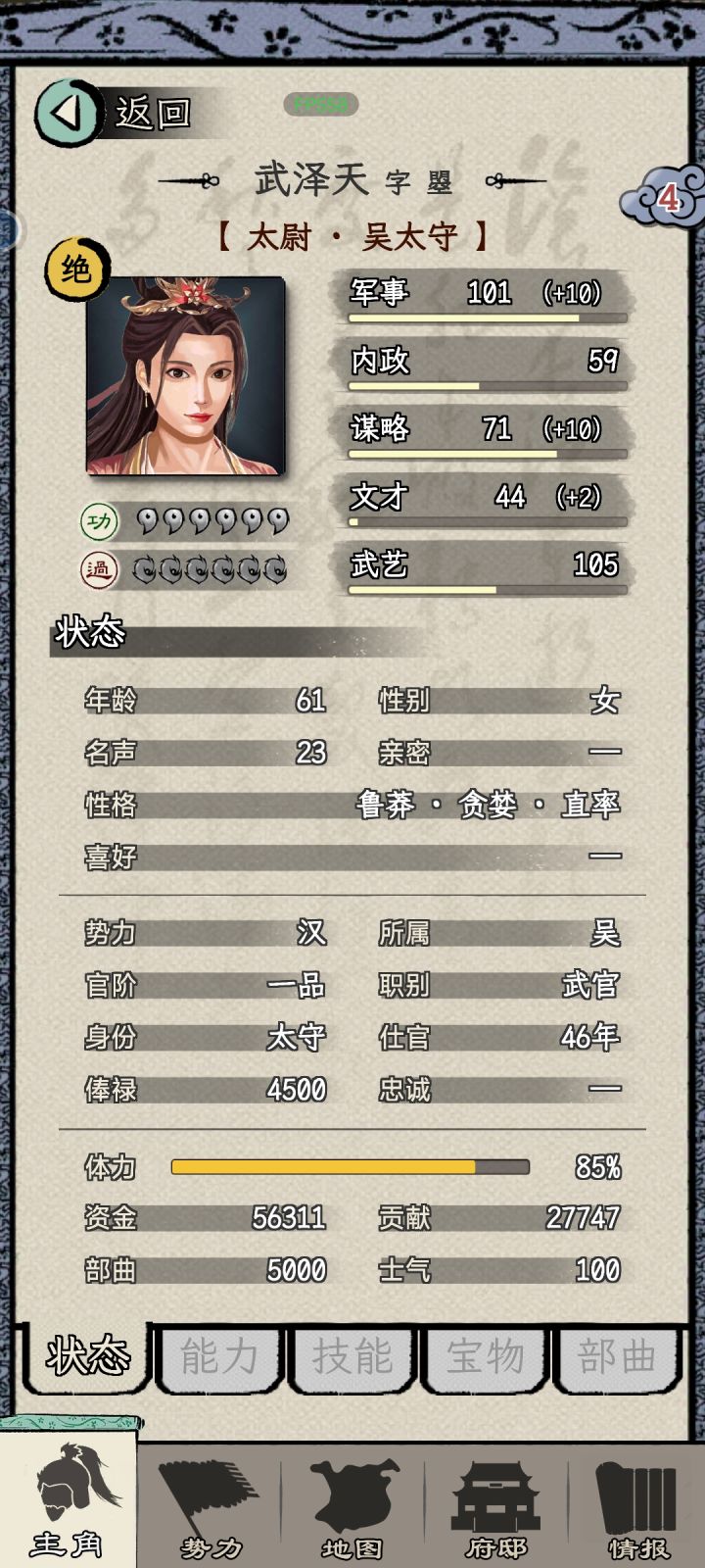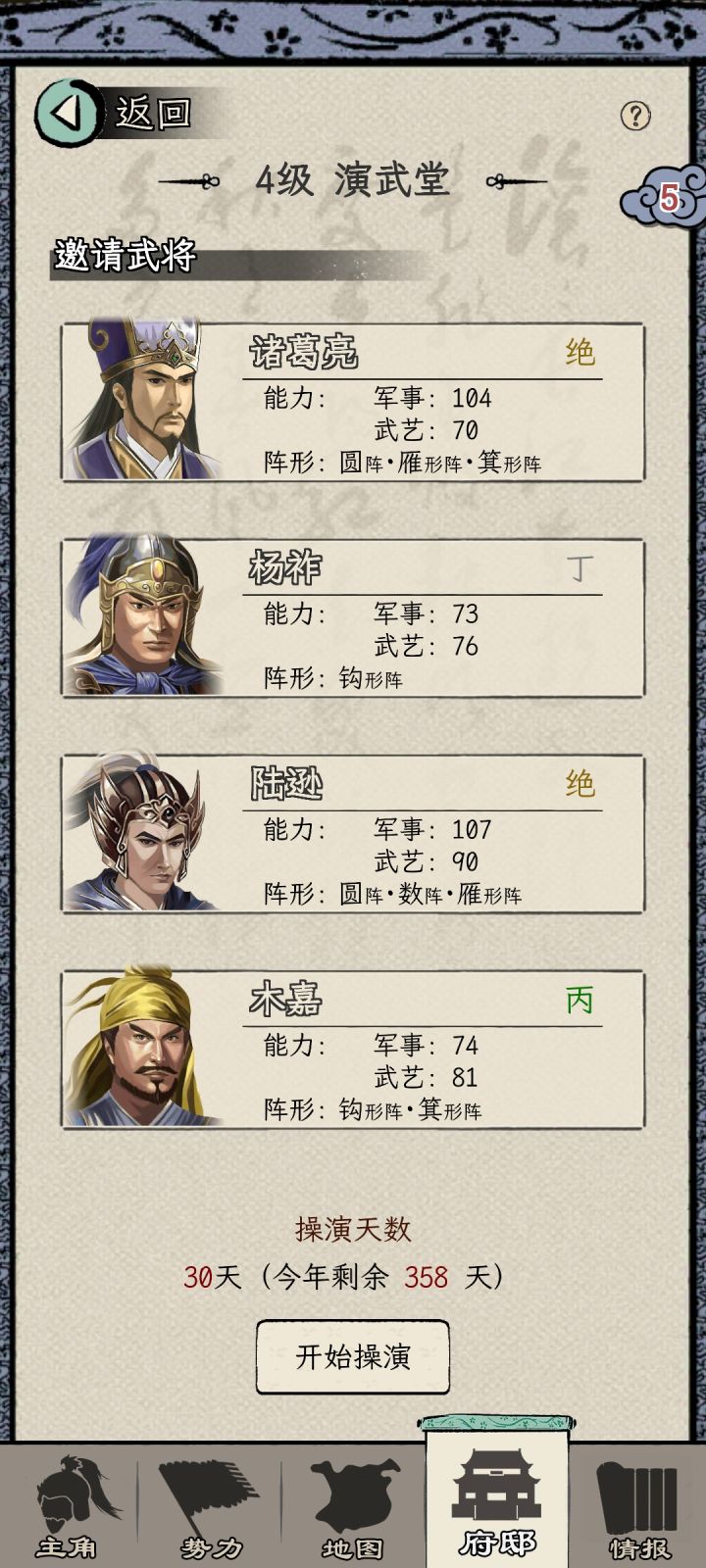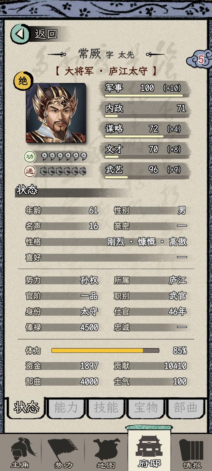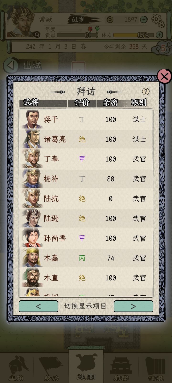 一路肝到了三品官,如果继续玩可能会把魏的家底都打下来,但是肝不动了,不如出个攻略供大家参考这局天赋少,前期一直立功到七品,然后保持不记过,不立功,这样多争取几个空闲的年头去提升自己每个年头都要至少空出1000铜币去酒馆办酒宴拉好感,去议事那里回答访客的问题(答题前先点情报—势力图,心里有个底更容易答对,当然如果你是像我一样的三国迷,就不用看了哈哈哈)至于提升主控的渠道,就是看书将军府的等级