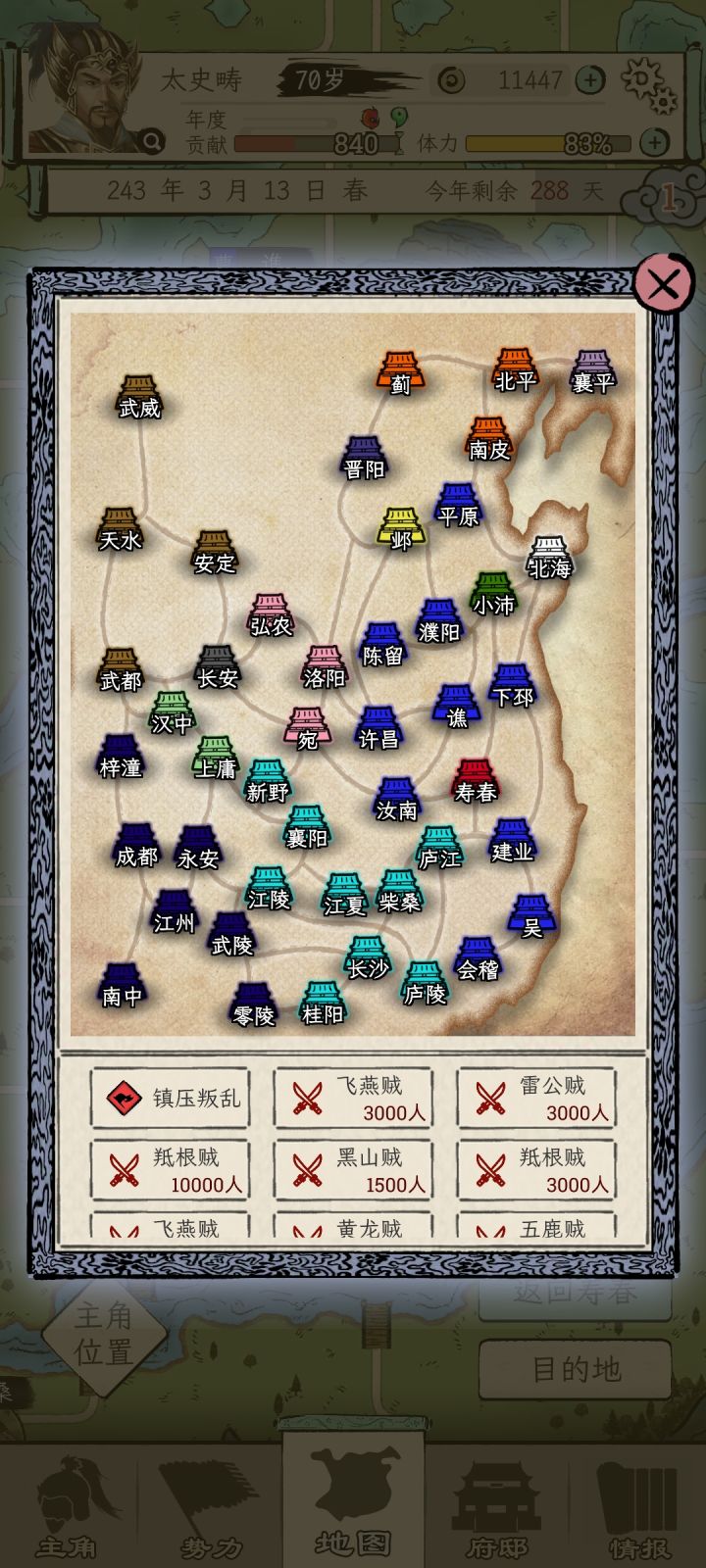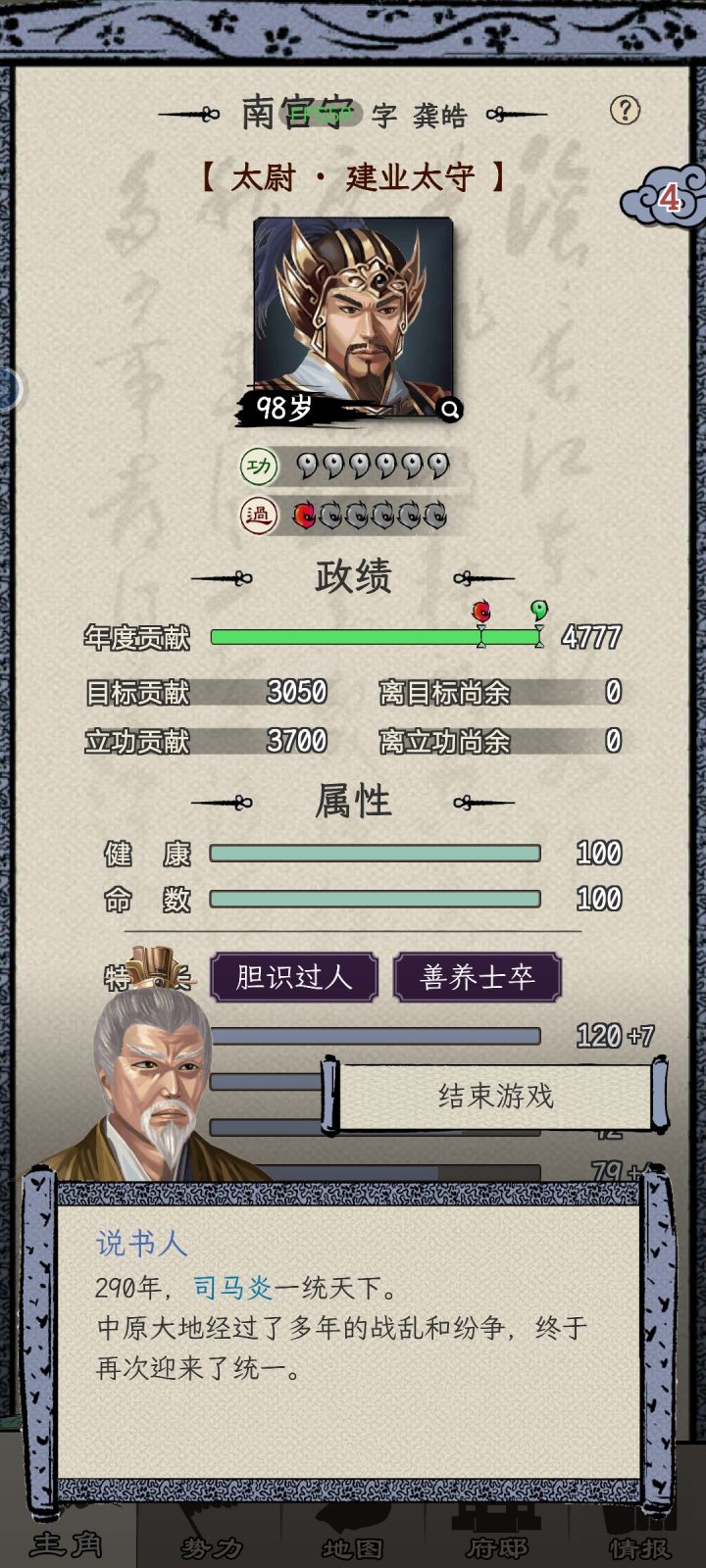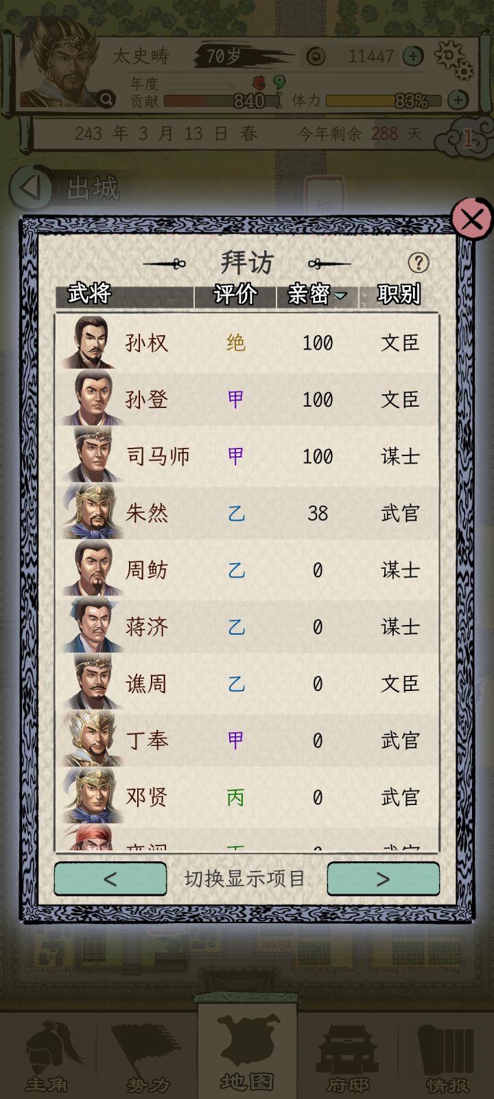 一路肝到了三品官,如果继续玩可能会把魏的家底都打下来,但是肝不动了,不如出个攻略供大家参考这局天赋少,前期一直立功到七品,然后保持不记过,不立功,这样多争取几个空闲的年头去提升自己每个年头都要至少空出1000铜币去酒馆办酒宴拉好感,去议事那里回答访客的问题(答题前先点情报—势力图,心里有个底更容易答对,当然如果你是像我一样的三国迷,就不用看了哈哈哈)至于提升主控的渠道,就是看书将军府的等级