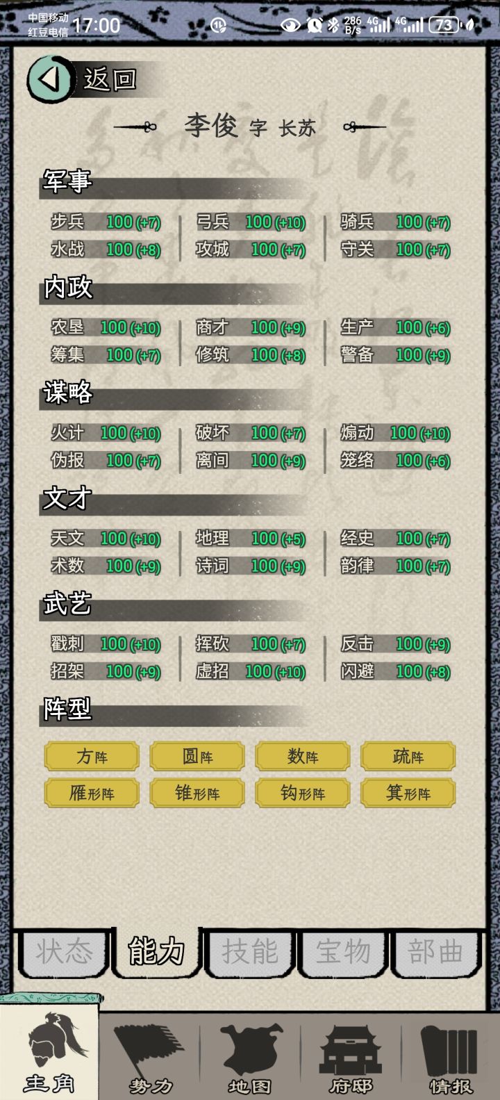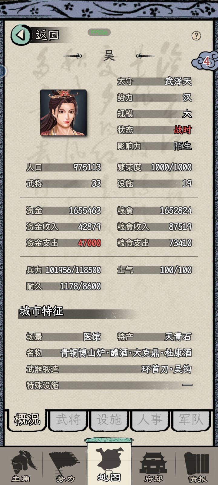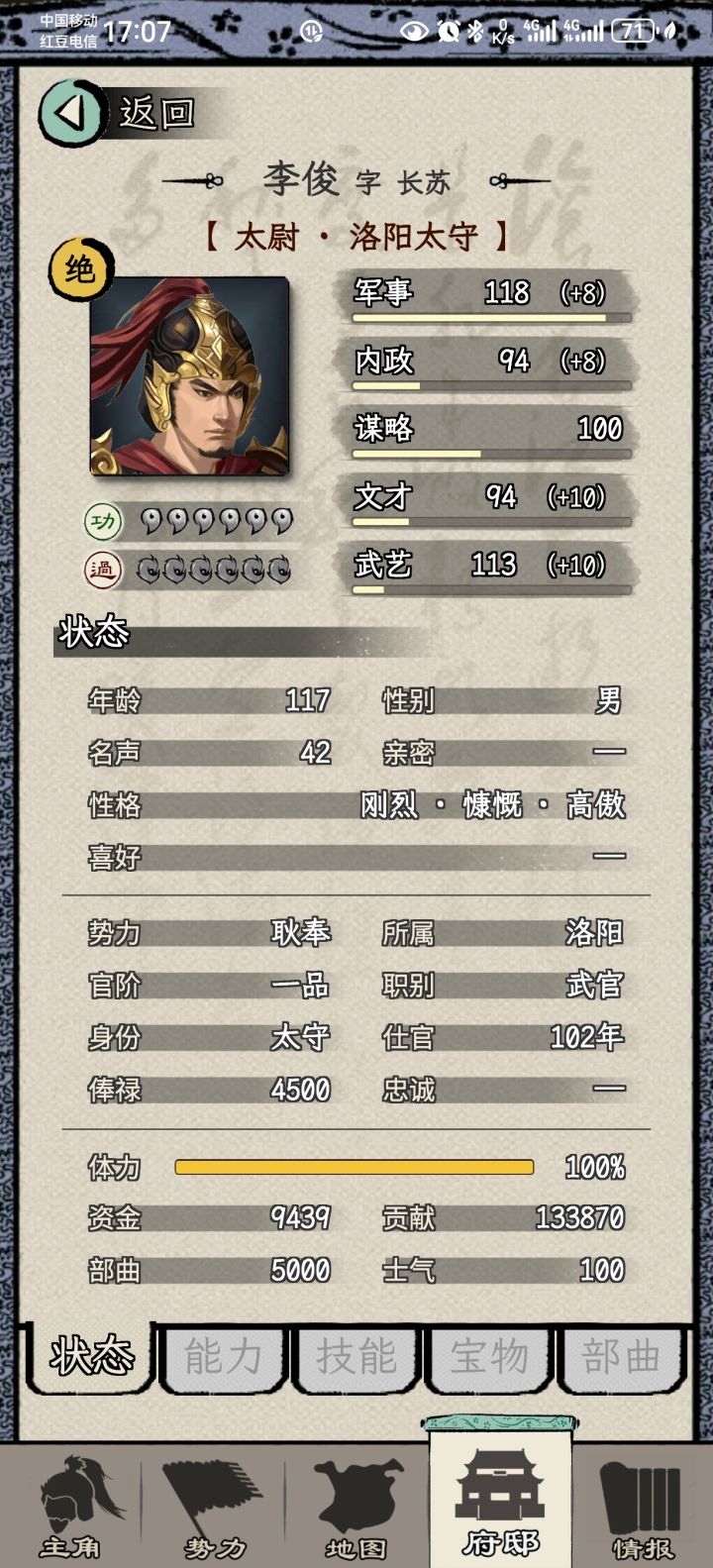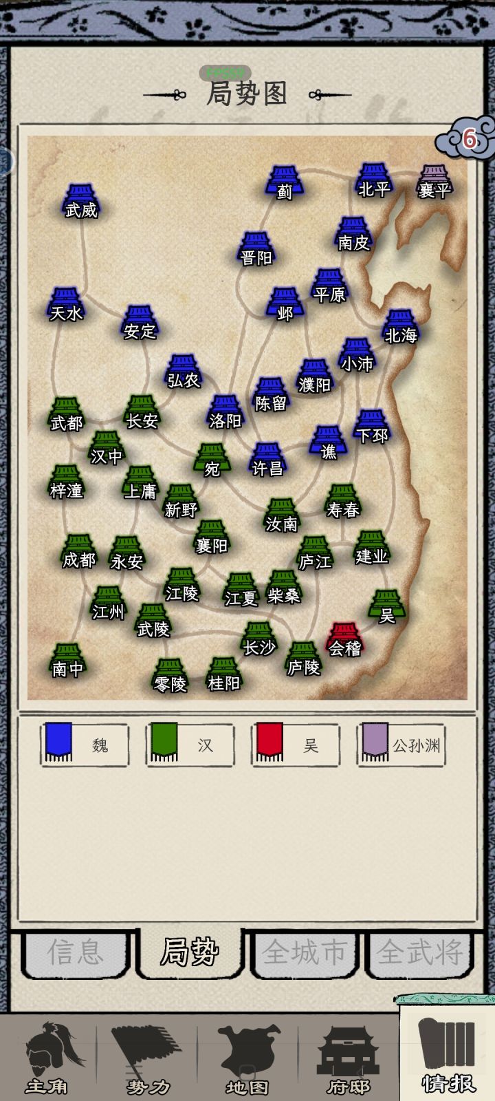 一路肝到了三品官,如果继续玩可能会把魏的家底都打下来,但是肝不动了,不如出个攻略供大家参考这局天赋少,前期一直立功到七品,然后保持不记过,不立功,这样多争取几个空闲的年头去提升自己每个年头都要至少空出1000铜币去酒馆办酒宴拉好感,去议事那里回答访客的问题(答题前先点情报—势力图,心里有个底更容易答对,当然如果你是像我一样的三国迷,就不用看了哈哈哈)至于提升主控的渠道,就是看书将军府的等级