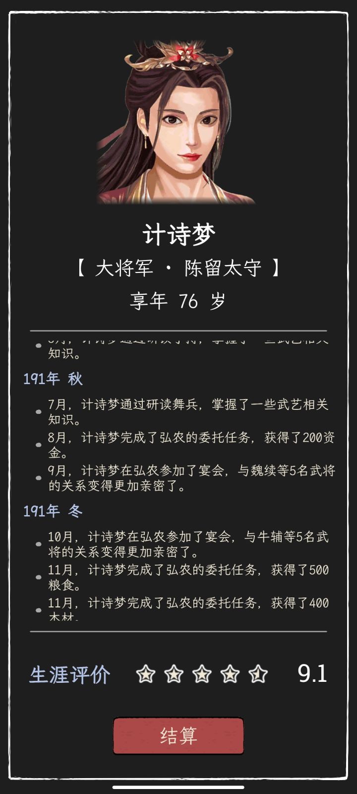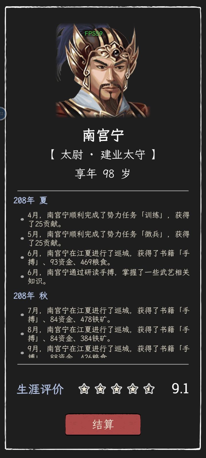 百年老兵日记189年 春,1月,15岁,在曹操麾下担任都尉,官居九品干了几年武将,因表现出色,军功显赫,当上了会稽太守只奈何内政薄弱,从政前期,经常因政绩不达标,被老曹批判熬了三十多年,官居一品太尉,顿时熊熊烈火,燃烧心中大肆练兵,攻城虐地,演武堂培养一代又一代的武将熬死老曹家三代后,发现君主任命是随机武将,太守不可以顿时心中拔凉拔凉,看着以前的下属当君主,一个又一个开启摆烂养老人