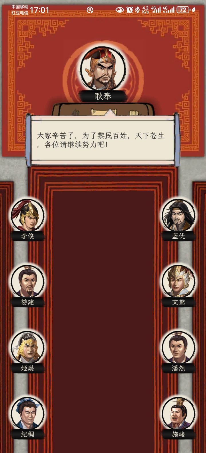 开局选刘备: 先说缺点:寿命太短了,后期我基本上无敌了,刘备领土基本上我打的,吴国被我灭了,能把要是寿命提高到90岁吗,强行让我65岁挂了。时间够我能刘备能统一三国了,游戏后期很简单了,约到后期约没有压力。 希望君主自立马上出来,自己当老板给武将发宝物应该有意思。优点: 整体画面、设计感还是及格,不用氪金,前期玩法尽量能看广告就看吧。毕竟研发人员也要生活,能理解,前期只要勾住猛升级属性就行,憋