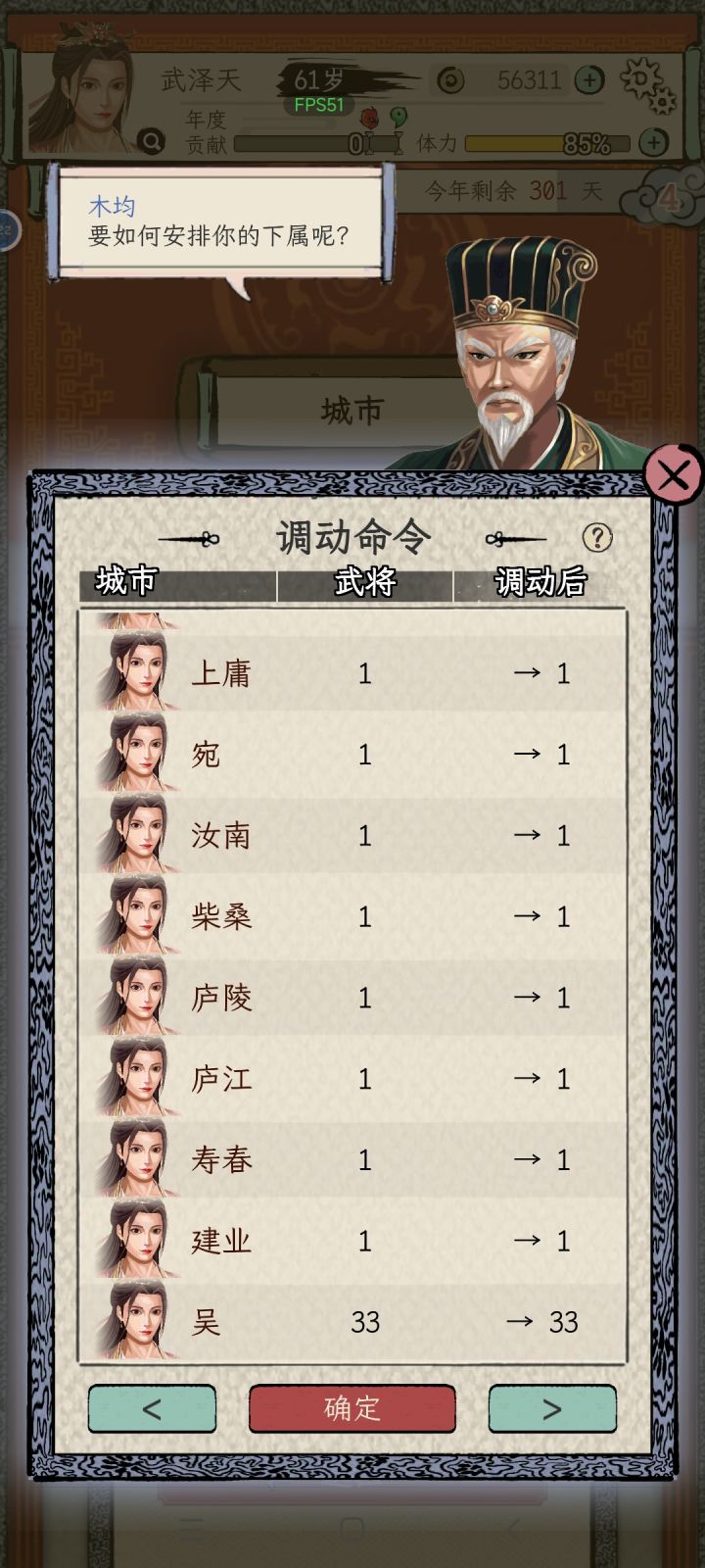 加入孙家,被分配到寿春朱治下,本来想着慢慢来,一点点苟实力,之后一鸣惊人,连年征战,一统天下。结果咱大魏吴王一直不拓疆,一直分不到城当不了太守,直到熬到230年,太史慈死了势力都解散了,朱治才寄,我才上位寿春。结果寿春只有5个武将,9000兵力,周围一圈兵力最低12000,要了两年人,发展了三年军事力量,结果,,结果,,,,孙权把庐江丢了,自己跑寿春了,寿春成首府了,我成郡丞了。。。。。不想