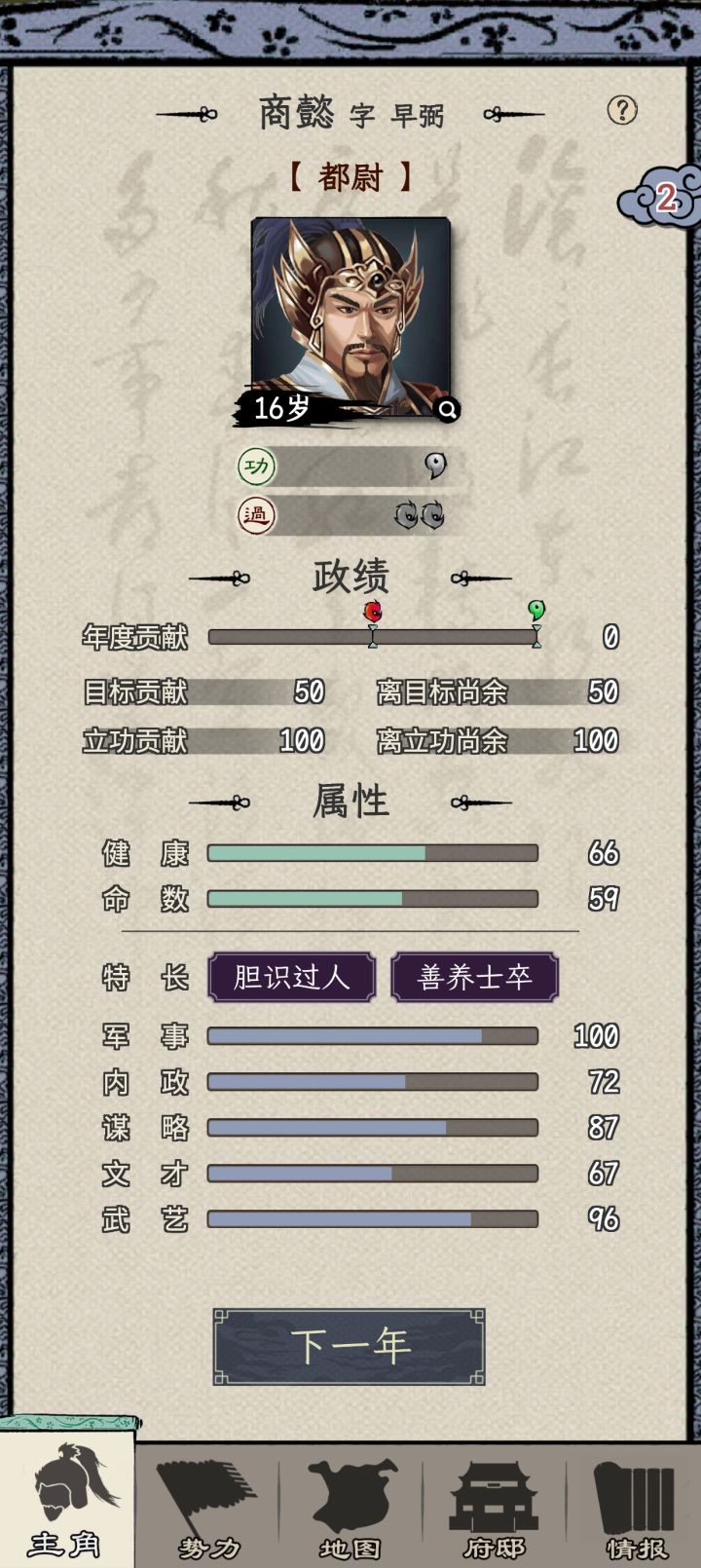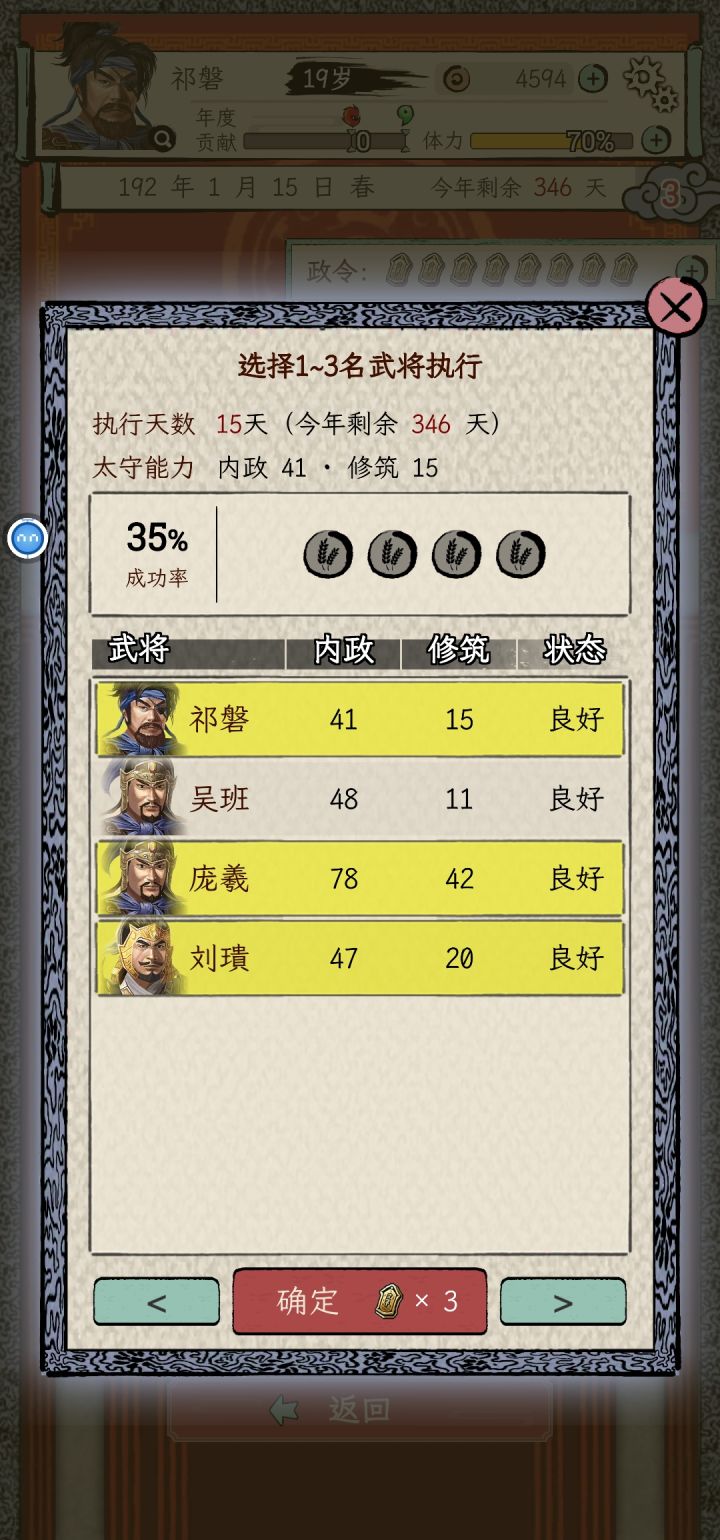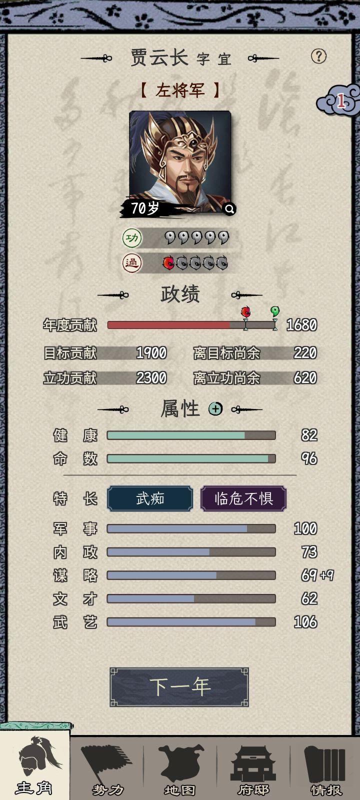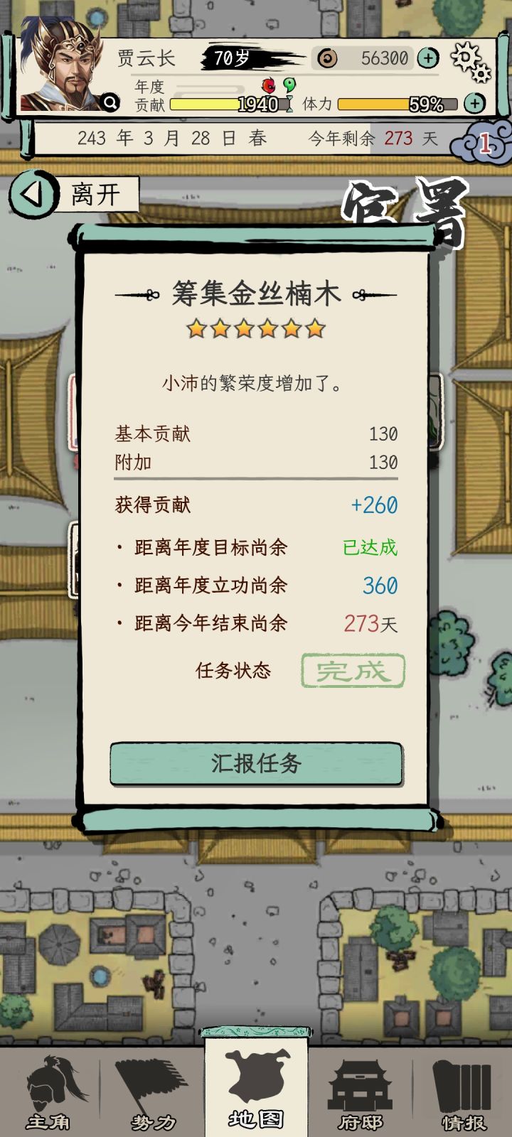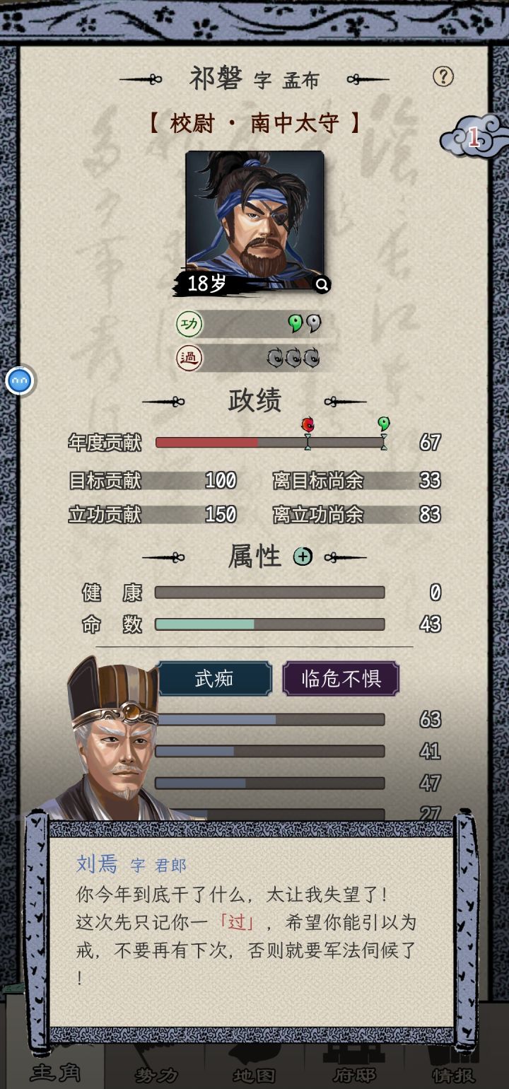 一周目选的刘备势力,苟到70能力也刷起来了,之前做任务可能还是能力不够没法立功升官,现在是不给刷了,都督的任务全是要求必须三个同僚一起并且多次任务不能重复选同一个同僚,但是将军府等级又卡了同僚数,这就导致了没法刷够立功的功勋。三品升二品的时候还好等校尉刷出金丝楠木任务交10个+打2蛮族超额+生产兵装正好可以立功,但是二升一的时候超额完成2个镇压叛乱,立功的贡献也还是差620,而金丝楠木任务只给2