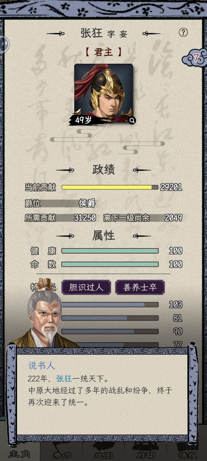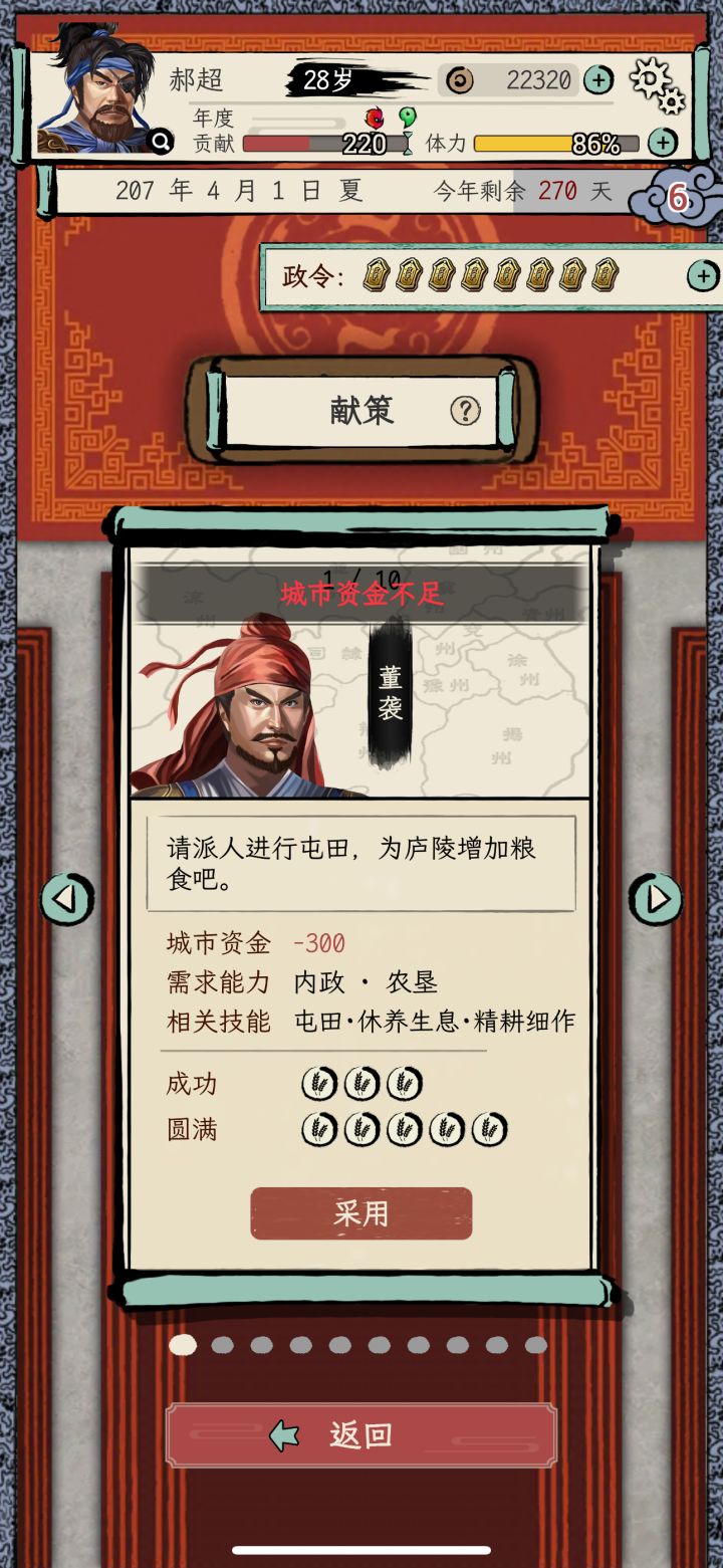 游戏将领都可以献策,为什么主角不可以?君主几十年都不攻打临边城池,不占城池就做不了太守 ,那样太累了,太无聊了。你能体会,不当太守一直做到一品大将军有多崩溃吗(◎_◎;)