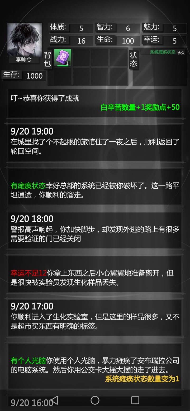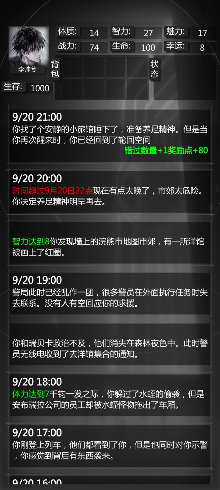 错过成就,硬性要求,魅力4,智力8,幸运5,体质7+随机刷丧尸犬事件拉长时间。美帝夜生活(魅力4)前往调查——(关键点🙌事件随机,多刷几次,可能会有多次遇见丧尸犬,占用时间,就能拖延)——智力达到5/溜去求援——幸运5——去列车那边看看——上前劝阻(体质达到7)——返回求援(智力达到8)关键点在于多次刷随机事件拉长时间。因为一直没碰上商人卖伤药,不知道如果有伤药算不算。