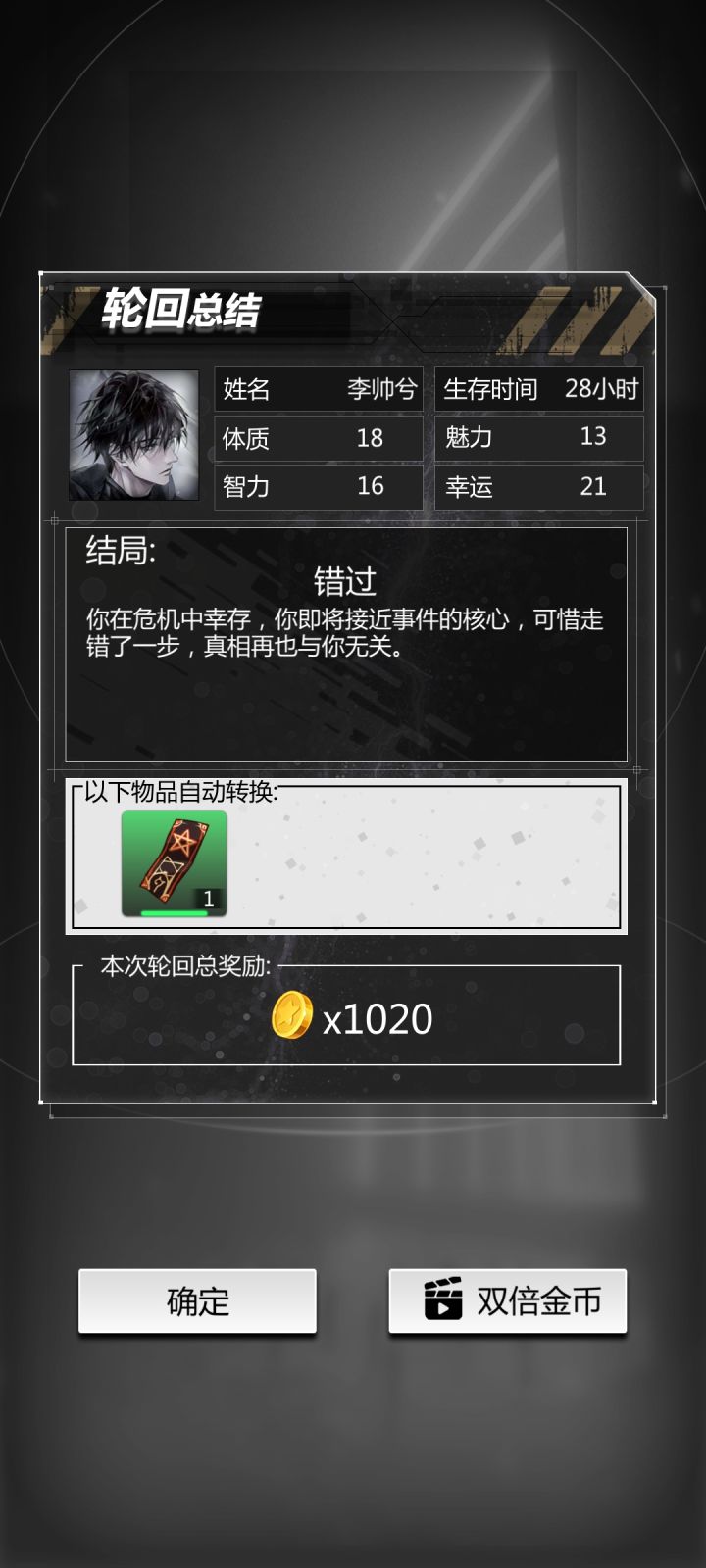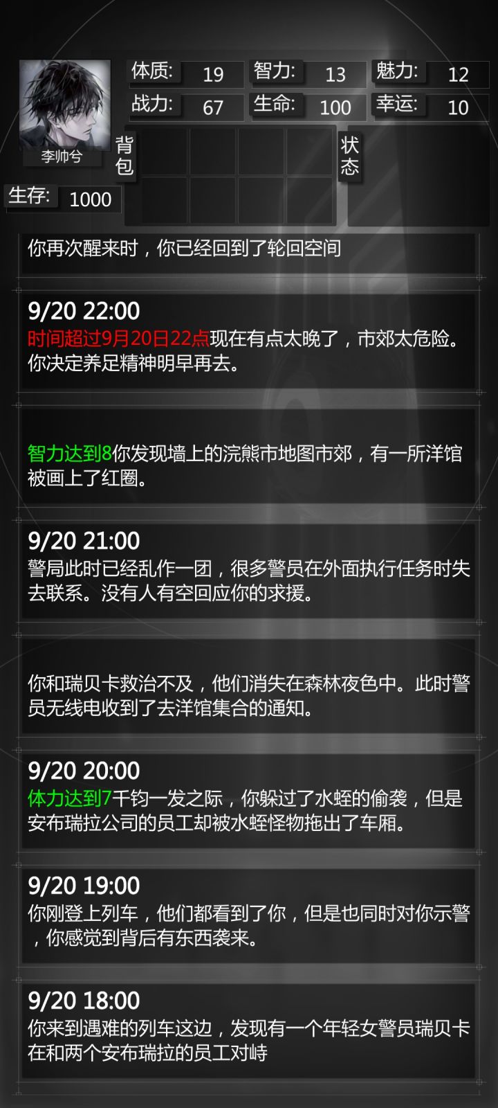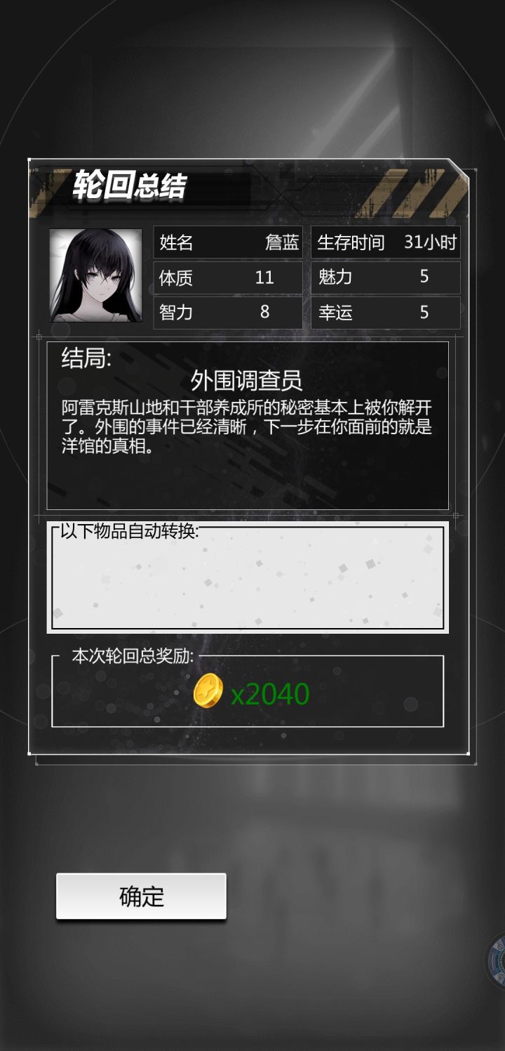 错过去夜店,搜索,杀了它为人报仇,回去求援,对峙选择阻止,然后如图所示。这攻略写着想提个建议给官方:能不能有一个单次轮回回顾,这没的回顾截图要好及时,不然突然死了压根没法截图做攻略,更会忘了上一回缺乏的通关属性条件。