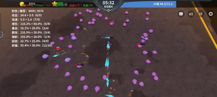 属性:高(攻速,群伤,弹射) > 高(暴击,增伤,攻击)。高爆发伤害溢出多不如射得又快又多。其次属性均衡战力更高。选牌:不考虑经验和祝福,5级以下拿+1牌,6级看情况对比+1,我也犹豫,7级往上必拿。开局先提战力活下来,最难的就是开局,战力安全下才敢拿经验和祝福,大概,30级前经验拉4,50级前拉9,后面拉16,拉晚了后面也顶不住。经验很关键,后面打不打的过全看升级快不快,祝福随缘,一般有+