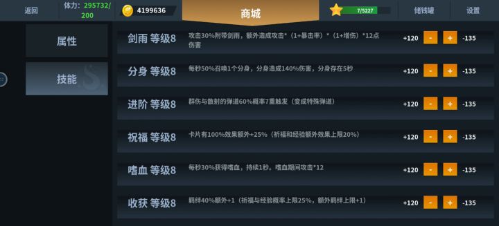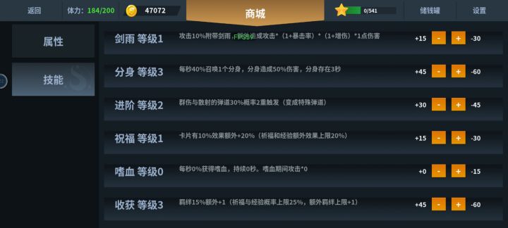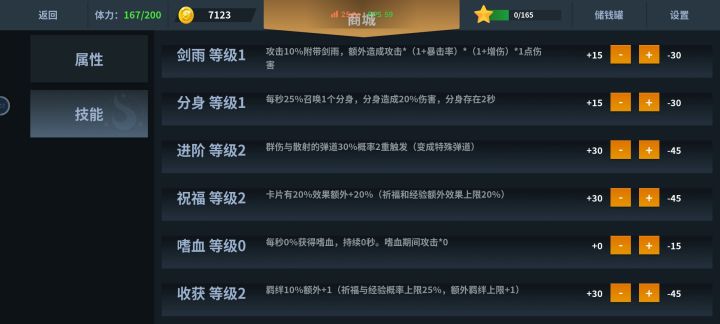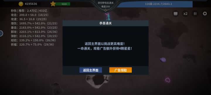 前期先把自动模式拿下,前面的什么加点推荐不用管,那个高点那个,技能上分身yyds,加点尽量平均,基本打到60关算出新手村如果你跟我一样38难度716星这样靠宝箱经验升星也可以一般到60级难度算出新手村说到星星⭐️,这是一个前中后期都很重要的东西,除了打关卡,开宝箱,还有商店广告,一命通关4星,复活通关3星,但无论怎样星星都是很重要的。所以为了快点出新手村,别吝啬你的那30秒时间吧中期等你到