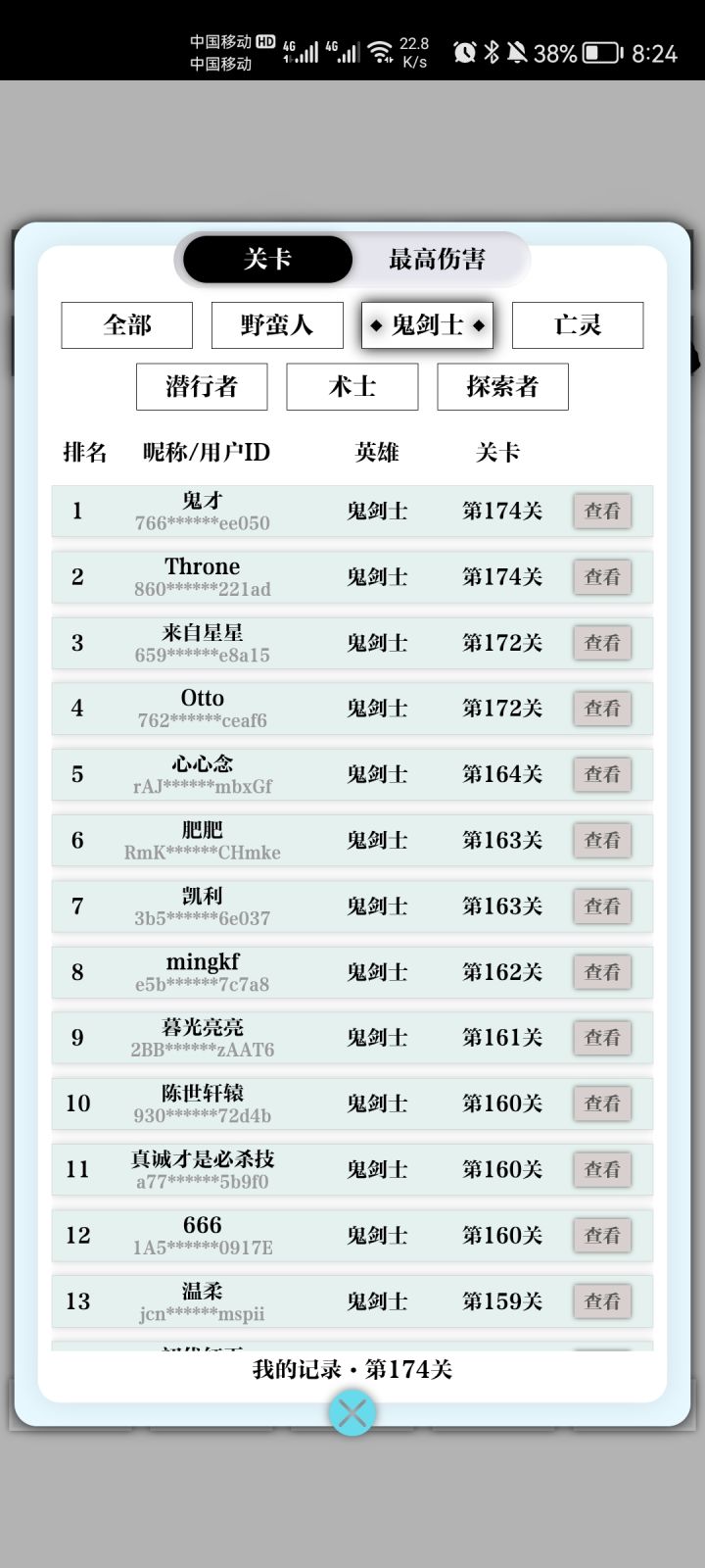 讲一个非常小众的职业-鬼剑士。并且可以说目前好多玩鬼剑士的方向是错的。鬼剑士排行榜目前第一,出装是闪避流,基本和亡灵流思路相同,而其他前五则都是攻击装却不堆闪避。闪避恢复更新加强这样他们是没有吃到红利的,鬼剑士高达80%的闪避上线,让他承受一次伤害后,可以迅速回满,除非一刀暴毙。我只到174是因为刚想到思路,随便试了一下,没有腐肉堆积叠肉,被一刀秒了,等后面选到更合适技能还能再提一波上线。
