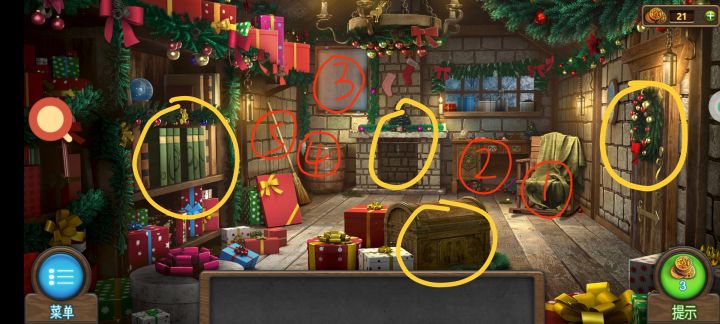 ❶红圈1处用钩子获得:小雕像1。 红圈2处获得:火柴。(在桌子底下,多点几下) 红圈3处得到:空白的纸。 红圈4处得到:胡子。 红圈5处用扫帚把灯上的另一个小雕像戳下来,得到:小雕像2。❷黄圈处点击为后续任务做准备。❶白圈1箱子处使用小雕像,完成小游戏,得到:钥匙。❷白圈2处使用钥匙,解锁场景院子。院子,❶红圈1处获得:柴火1,点开电箱,获得:金属丝。❷红圈2处获得:①柴火2,