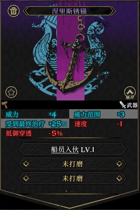 斥闻海民中,有愚蠢的狂热者想献身于涅里斯(深海者的子嗣之一),在船锚处刻上涅里斯的纹样,召唤“女神”。好笑的是,使用此船锚的船只,极少发生触礁事故,也许当船员最渴望之物就是涅里斯的时候,涅里斯也无从下手了。渐渐地,传闻传开,刻有涅里斯纹路的船锚反而被用来当作船只的保护符了。这就是一根刻有涅里斯纹样的船锚,锈迹斑斑,估计是被哪个力大的海盗随手当作武器来用。