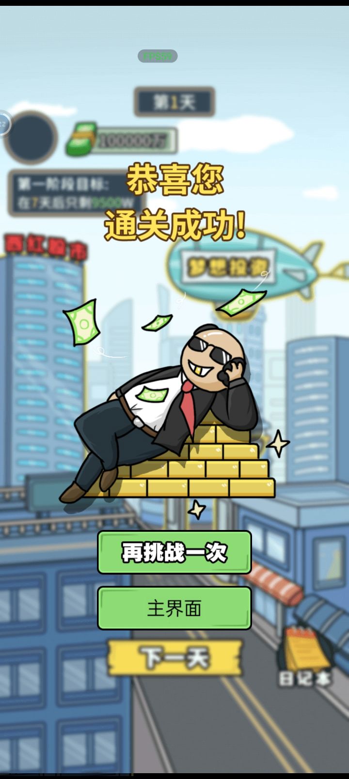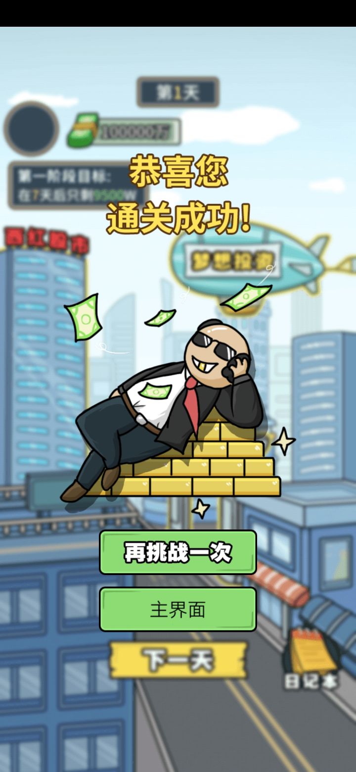 玩了两次,第一次莫名其妙通过了,第二次试着赚钱, 资产翻了1倍,然后通关失败,我还以为有什么彩蛋,结果啥都没有。😤😤😤