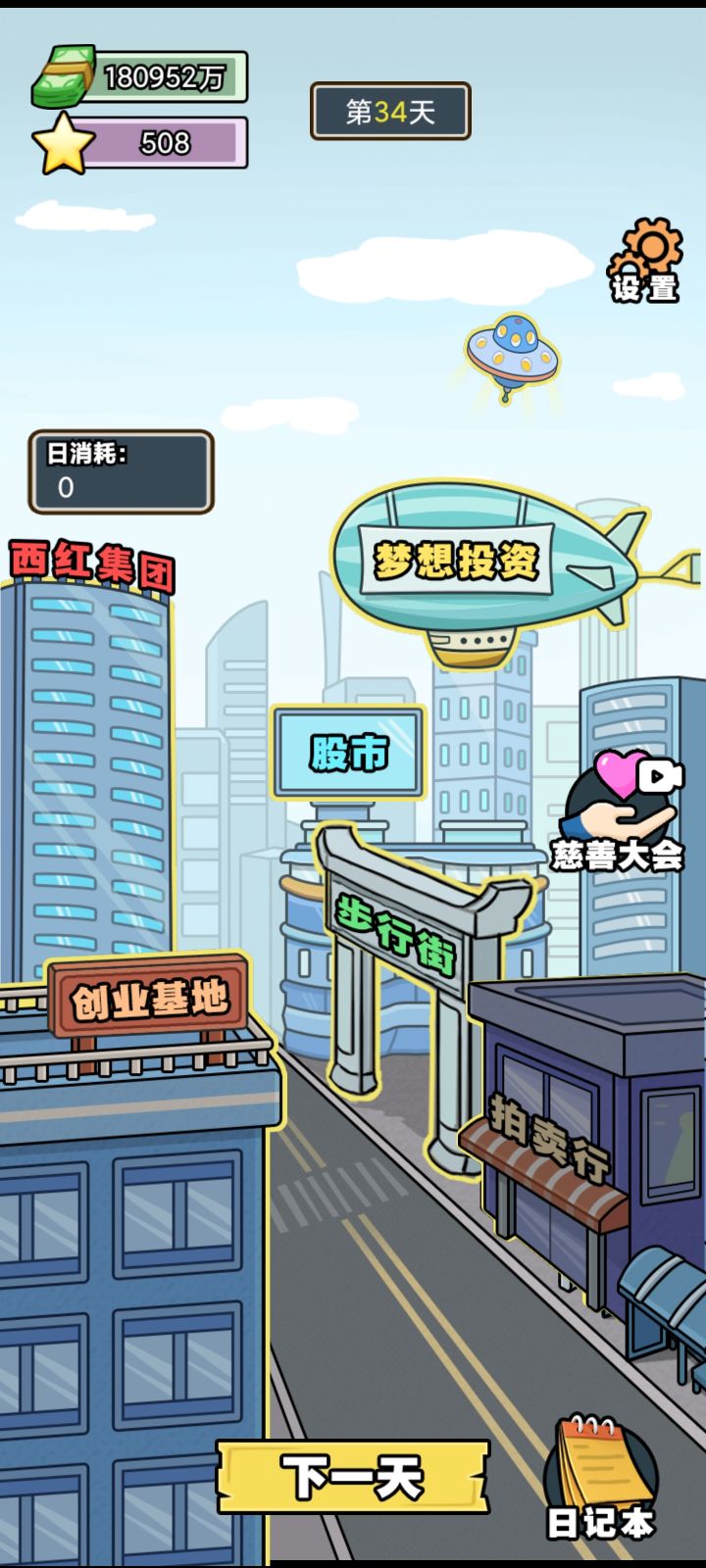 不要开公司N必须看一个广告,解锁梦想投资人。然后无限雇人,鉴宝。拍卖会不要去,有声望就解锁,第23天的时候,一天消费3.5亿,两天就结束了