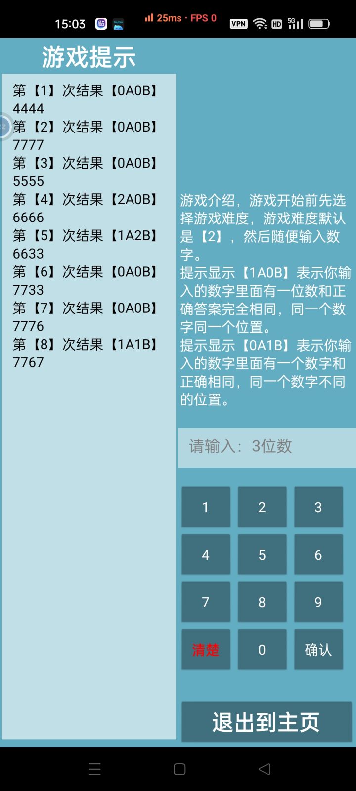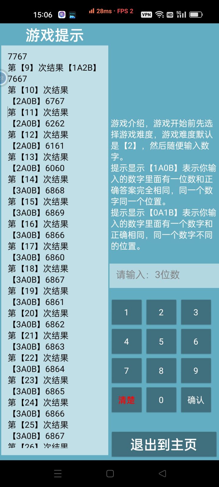 新功能有bug,默认难度提示请选择难度,而选择了二号难度三位数则实际上是四位数。如果输入三位数会出错。对于检测AB的代码有问题。如图可知,像是这里,存在了无正确答案,以及AB被反复计算的问题。已经是A了但B也多了一