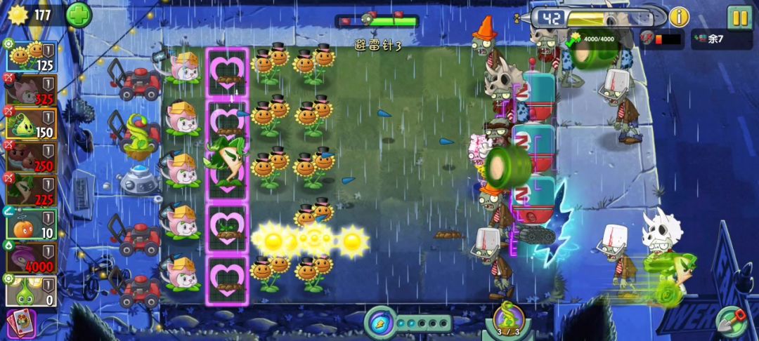 把熊果滚不掉的矿车刷了,因为刚开局的下一波僵尸少我就没给豆,第二个下一波出来有节奏给熊果喂豆,运气好就是这个效果