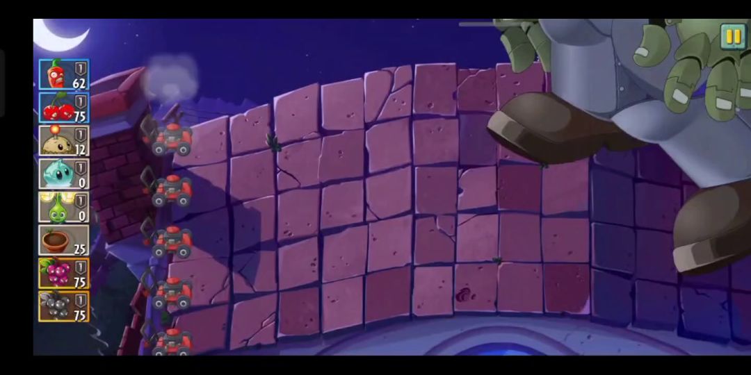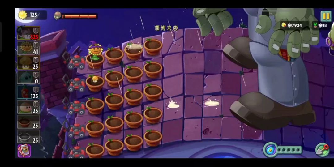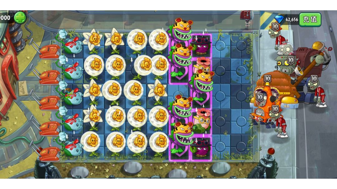 上1列芦藜药师配合棱镜塔神器打boss更简单,开局点下一波出僵尸,在上2路的话给上面的熊果豆,在下3路的话给下面的豆子,剩下的一直给下面的熊果豆子。