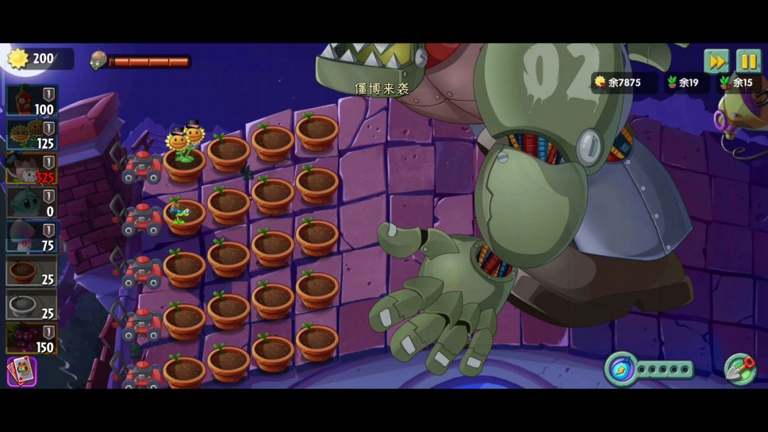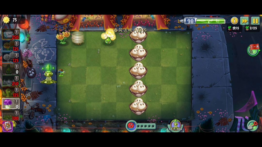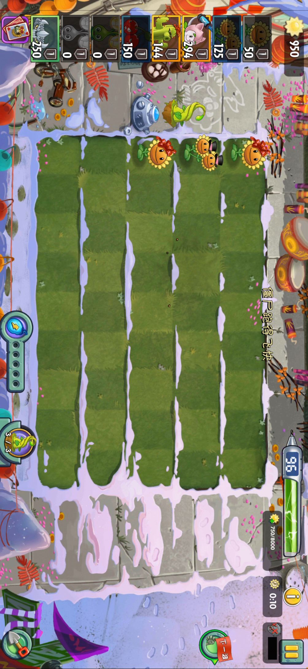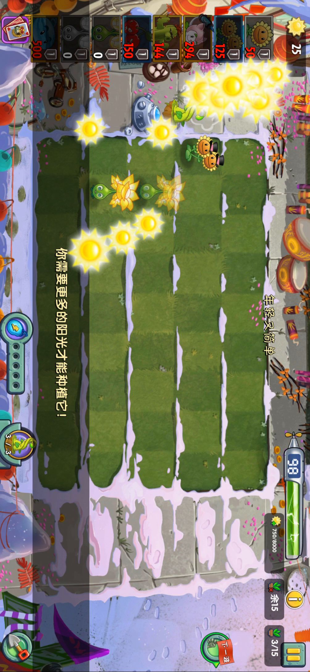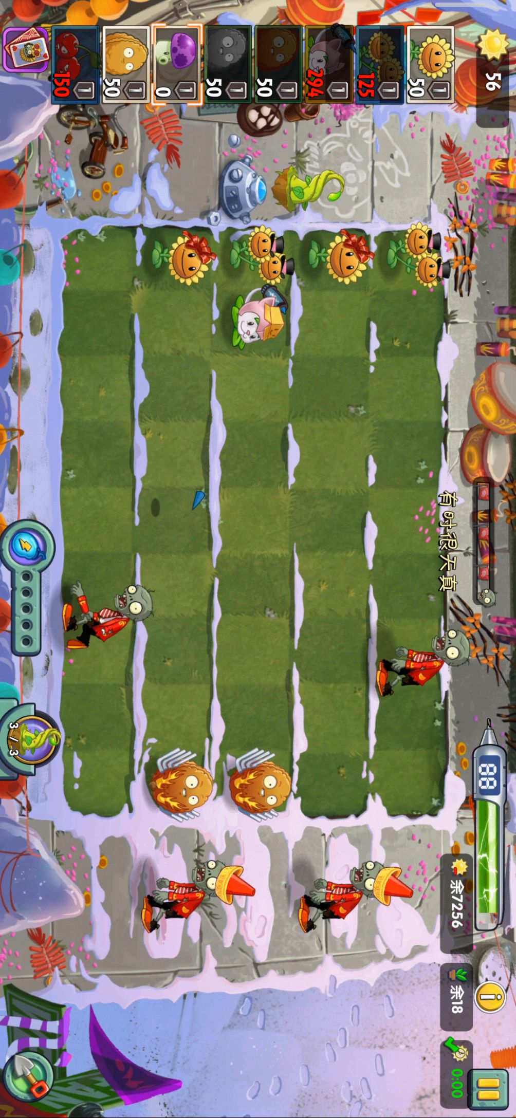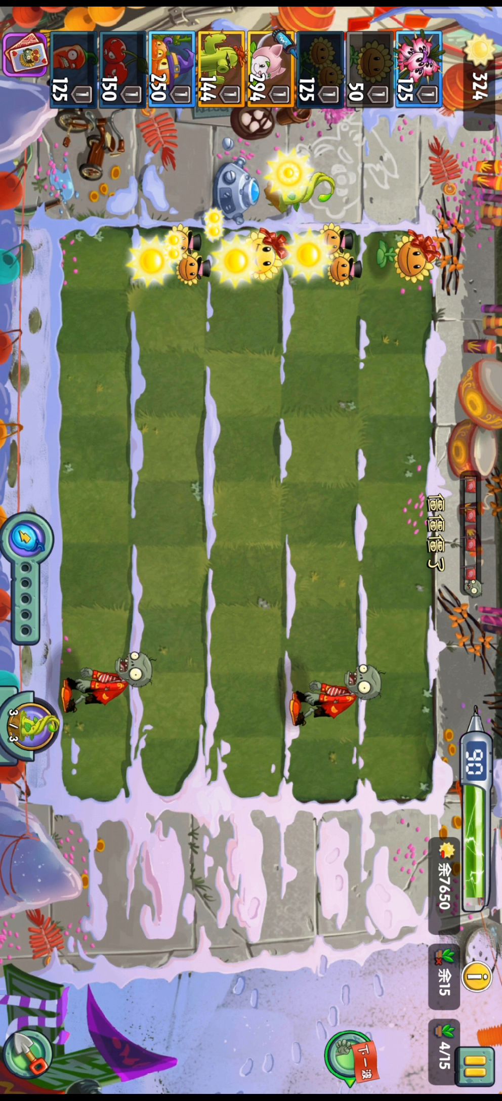 还是先攒阳光,先在第5列24路种植冰龙草,第7列种满地刺王,剩下的就种仙人掌就行。