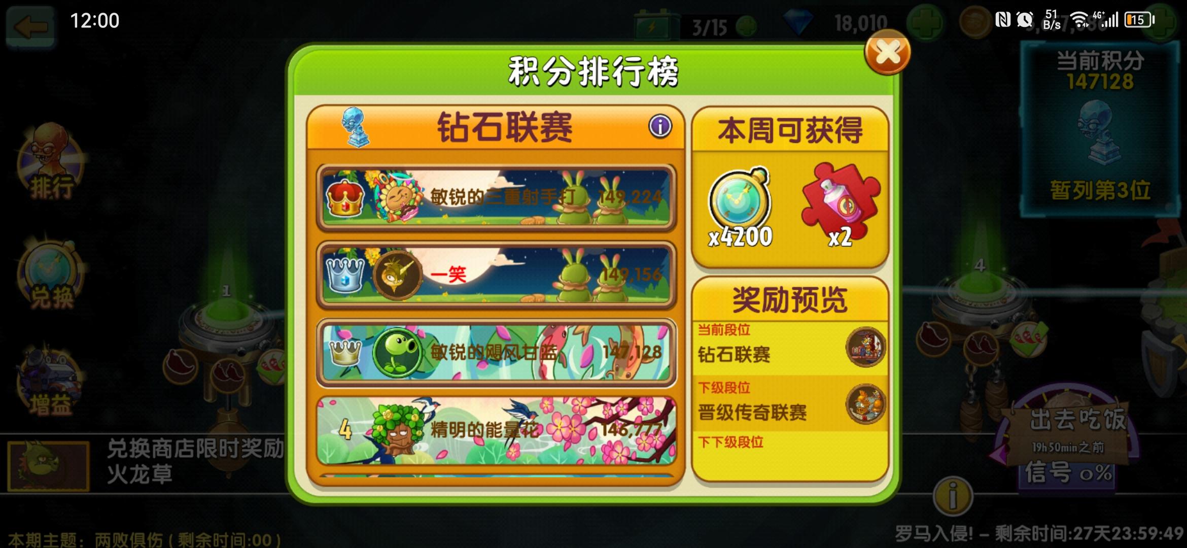 打的最难受的一次追击,和第四名你来我往,相互凹分,从14.4打到14.7,最后半个小时还是我偷榜成功