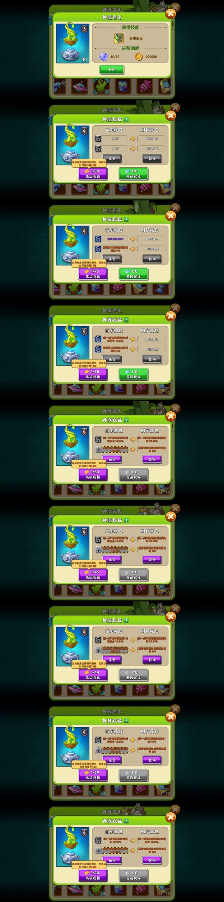 第一个四阶神器,黄金券用光了,刷不出来第一次种植无冷却,那几个橙色一直反复横跳。就这么难刷?#植物大战僵尸2