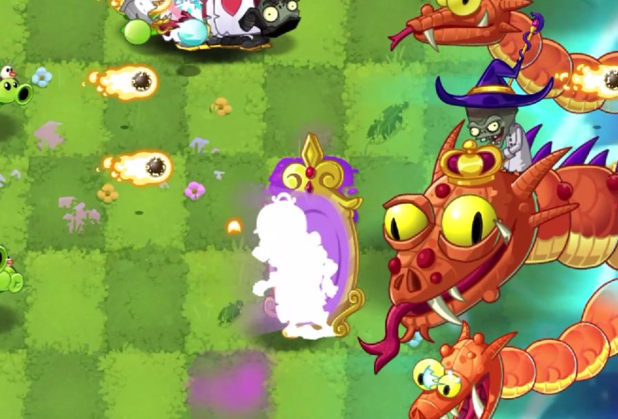 【童话僵尸博士】兼具科技和幻想的邪恶作品。僵尸博士想用一种更有效率的方式展开入侵,他动用了三条生产线,三倍的钢材,三倍的员工……甚至在把那些黑魔法数字化的时候,他使用了三进制。有人称赞他说一不二,可他说的是三。 特殊技能:用魔力和邪恶铸造而成的附庸,小蛇头会在切换阶段时逐个发动技能,为主蛇头提供护盾效果,在击败小蛇头前,无法对主蛇头造成伤害。 技能一-魔镜召唤:释放法术,在场上召唤一枚