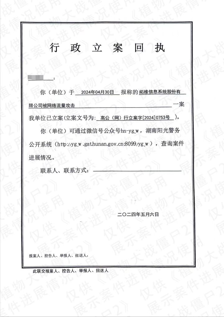 针对《植物大战僵尸2》近期遭受的网络流量攻击,我们已向湖南警方报案并得到立案侦查。我们对警方的迅速反应和支持表示衷心感谢。 我们警告所有企图破坏游戏环境者立即停止非法行为。对于屡次挑战游戏公平性底线、破坏正常用户游戏体验等侵权行为,拓维信息系统股份有限公司将采取法律手段,对作弊外挂团伙、贩售盗改版团伙进行严厉打击。 为保障游戏安全,我们正在加强游戏防护措施,包括但不限于加固游戏包体、排查通讯漏