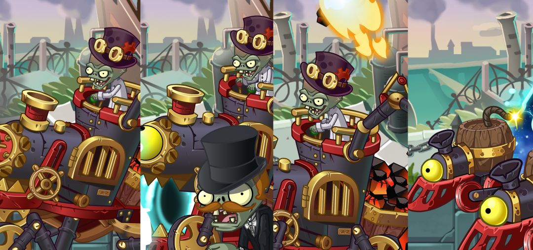 僵尸博士带着他的全新机甲回来了!全新 boss 已经在蒸汽时代严阵以待,终极之战即将开启,敬请期待! 【技能1-召唤僵尸】开启时空漩涡,将大量蒸汽时代的僵尸送入场内,随着阶段推进,召唤的僵尸数量变多,种类也将会愈加强大,一大波僵尸即将来袭! 【技能2-发射导弹】全新升级的导弹发射器,可以对场上的植物展开精准打击。随着阶段推进,发射的导弹数量将会增多。 【技能3-投掷煤炭】操纵机械臂,将机甲